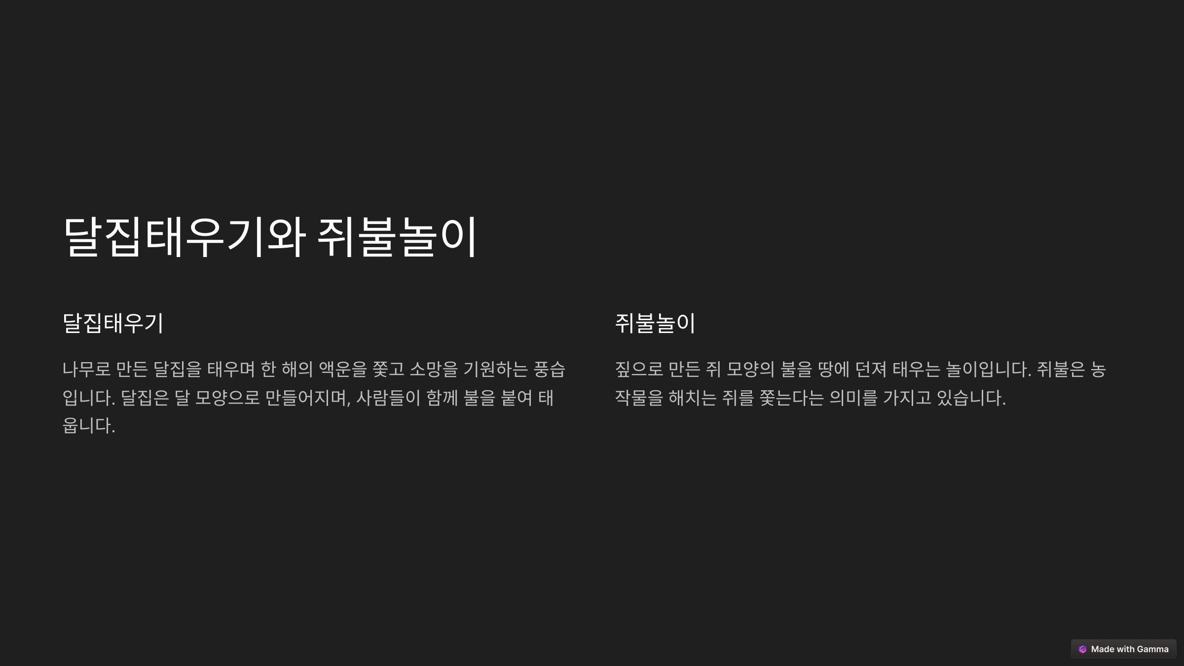 | 달집태우기 | 짚으로 만든 큰 구조물을 태우면서 소원을 비는 행사 | 액운을 없애고 복을 기원 |
