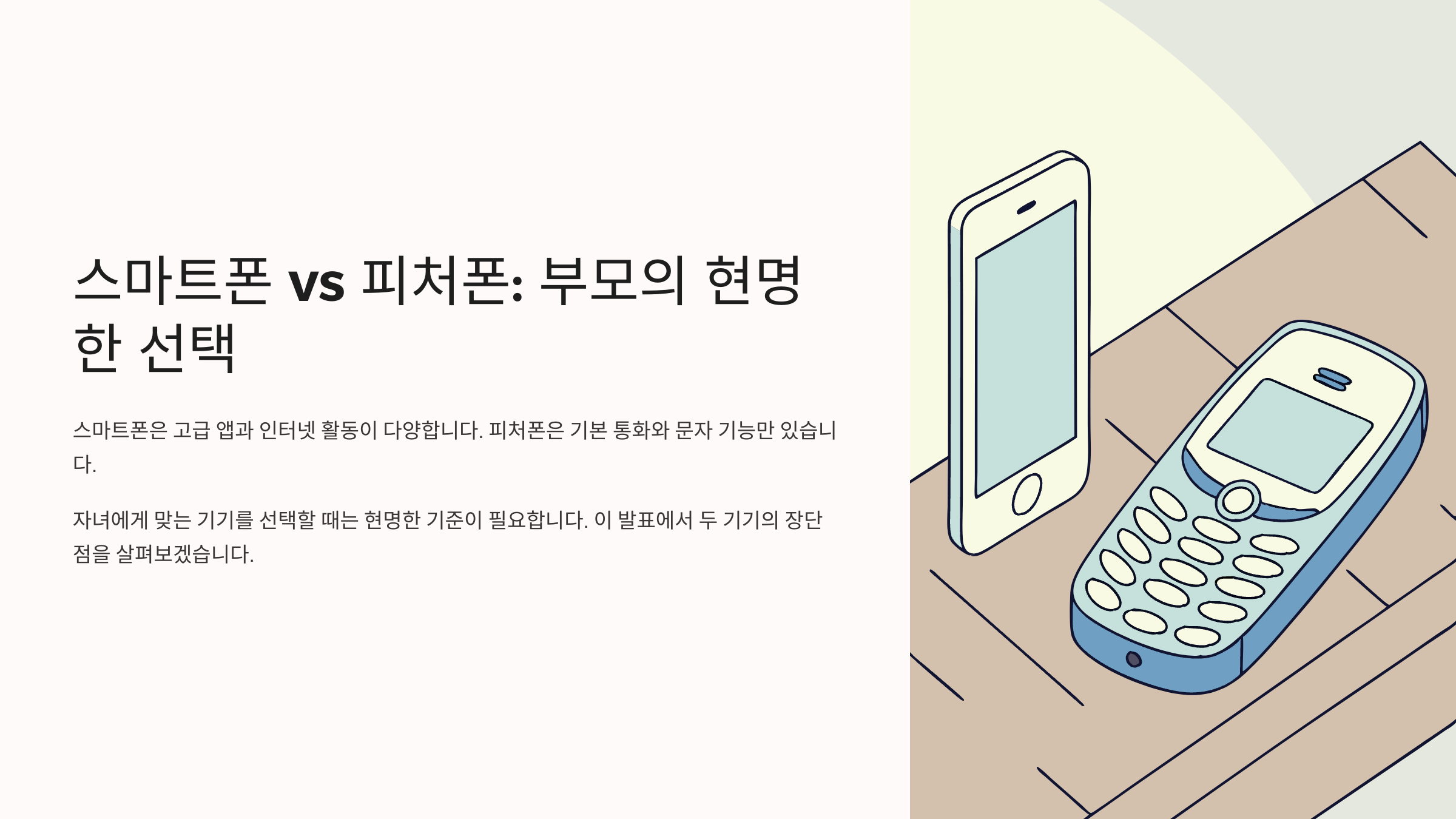 스마트폰과 피처폰 중 어떤 것을 선택하느냐는 단순히 기기 스펙의 문제가 아니에요. 자녀의 성향, 부모의 양육방식, 가정의 환경 등이 복합적으로 작용해요. 아이가 어떤 성격인지, 스스로 절제를 할 수 있는지부터 고려해보는 게 좋아요.