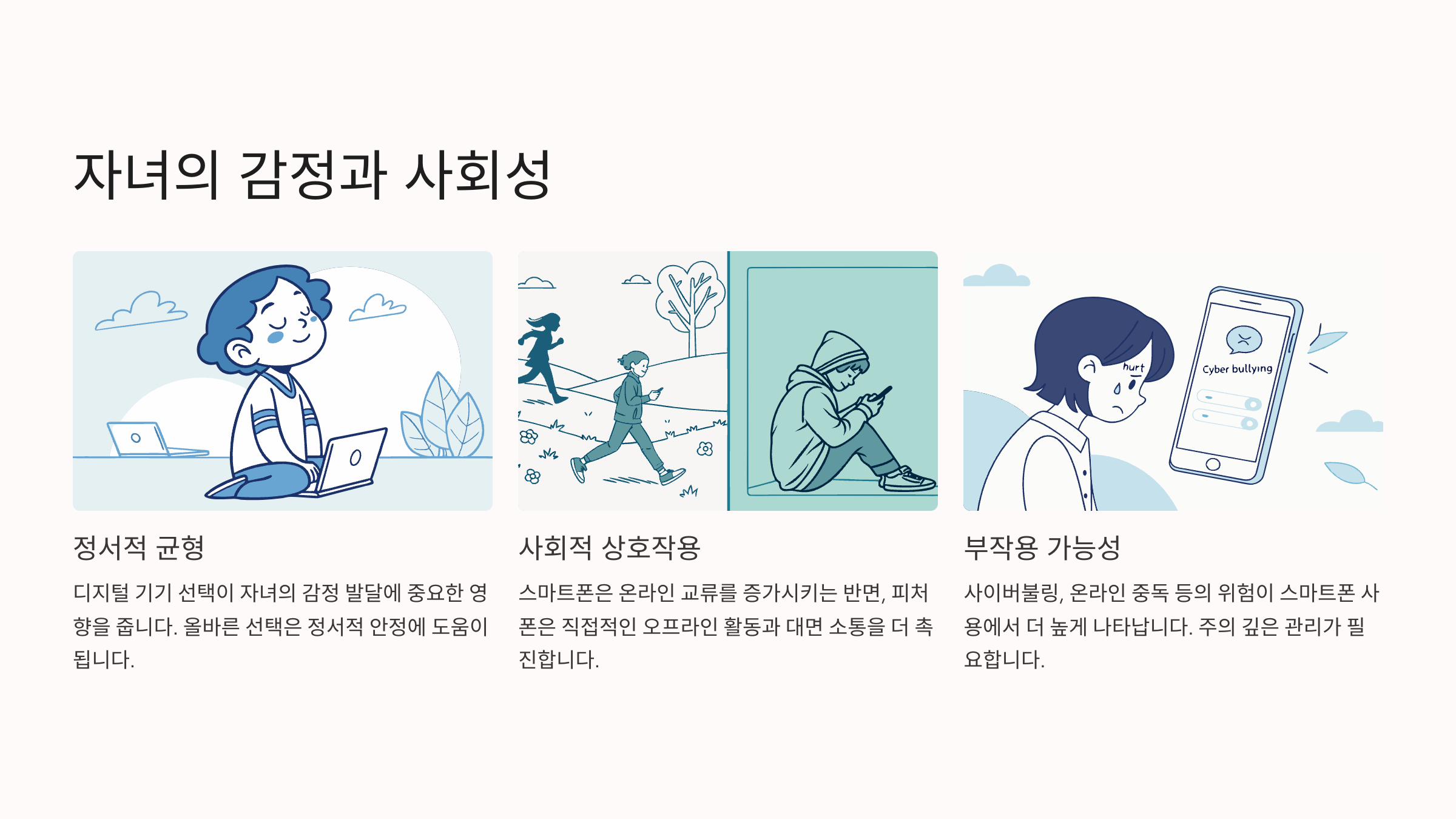 중학생 시기는 또래 중심으로 정체성이 형성되는 시기인 만큼, 부모가 아이의 감정을 민감하게 살펴보고 균형 있게 스마트폰이나 피처폰 사용을 조절해주는 것이 가장 중요해요.