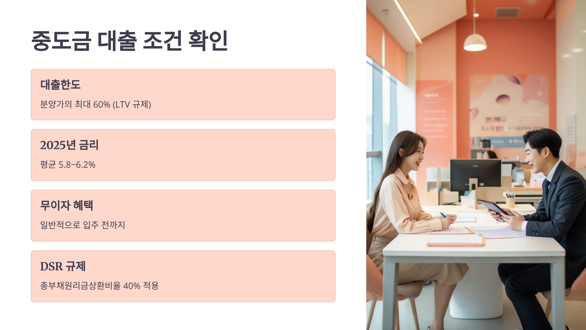 청약에 당첨된 후 가장 현실적으로 중요한 문제는 ‘자금 마련’이에요. 계약금 다음으로 이어지는 중도금은 대출을 이용하는 경우가 대부분인데요, 2025년 기준으로는 중도금 대출 규제가 강화되면서 꼭 조건을 잘 따져봐야 해요.