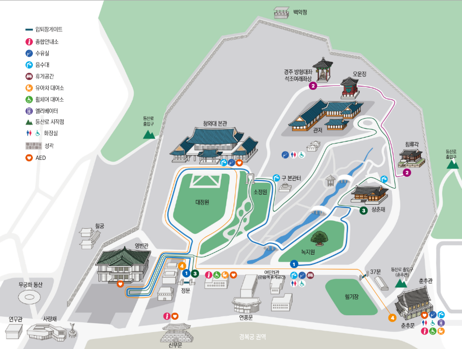 안내소에서는 관람 안내 책자와 지도를 받을 수 있어요. 특히 외국인을 위한 영문 안내서도 제공되기 때문에 외국인 관광객에게도 불편함 없이 관람이 가능하죠. 입장 후 자유롭게 경로를 따라 돌아보면 돼요.