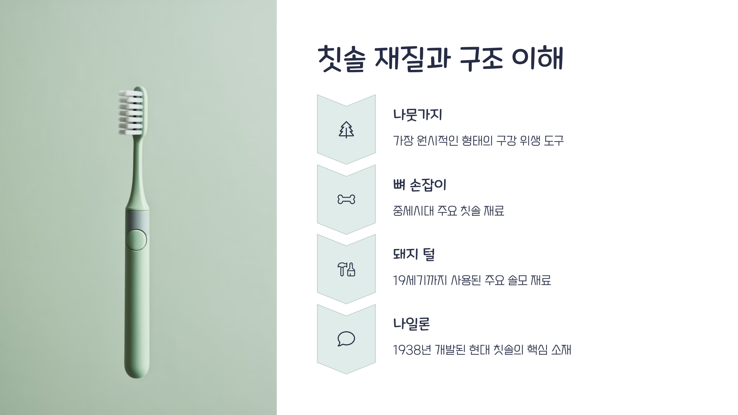 현대적인 칫솔은 15세기 중국에서 처음 등장했어요. 돼지털을 대나무 막대에 붙인 구조였는데, 이는 유럽 상인들에 의해 서구에 전해졌어요. 이후 1930년대에 들어서면서 나일론이라는 합성섬유가 개발되었고, 지금과 같은 칫솔 형태가 자리 잡게 되었답니다.