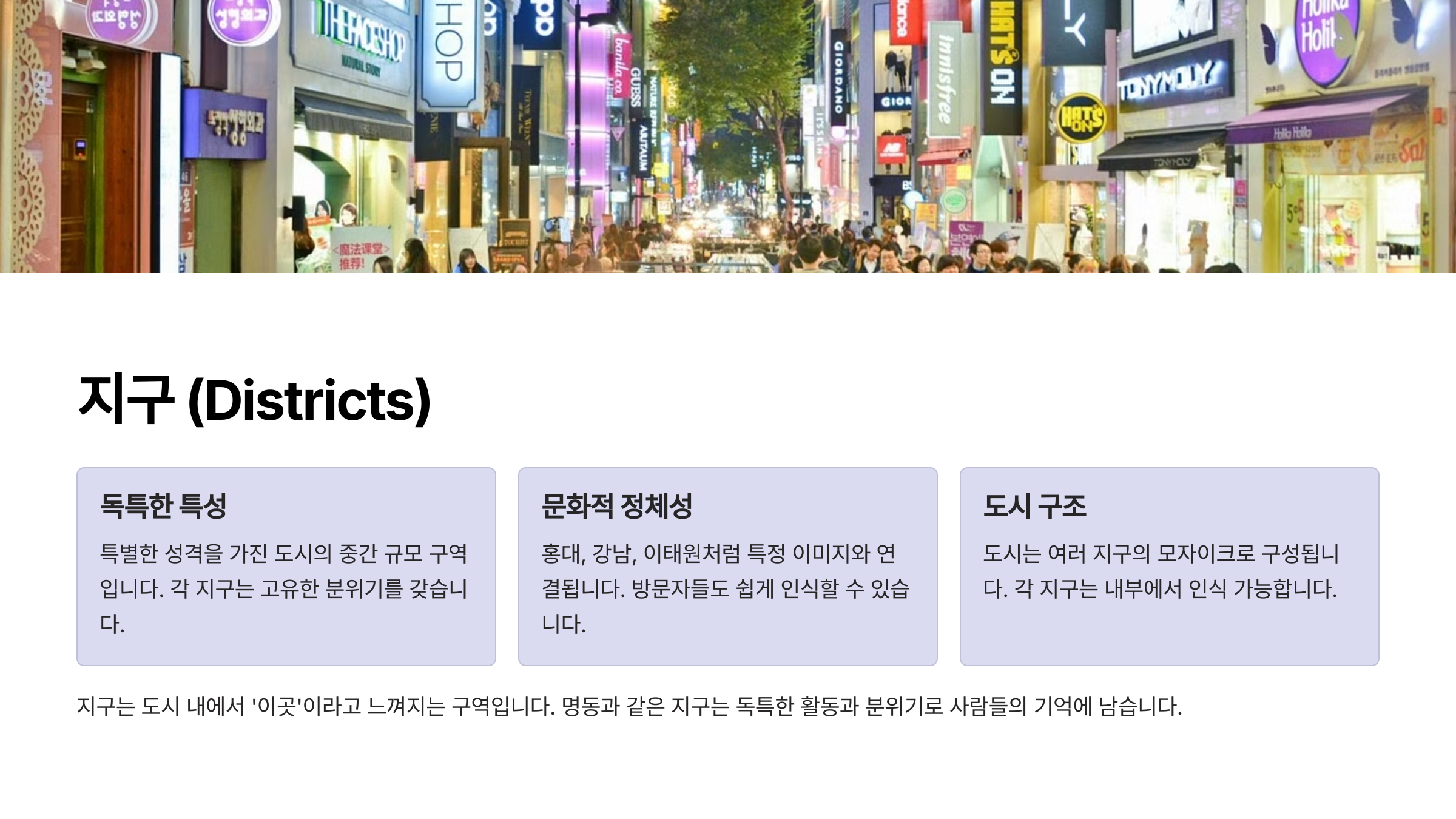 지구는 도시의 컬러와 분위기를 가장 강하게 드러내는 공간 단위예요. 🎨