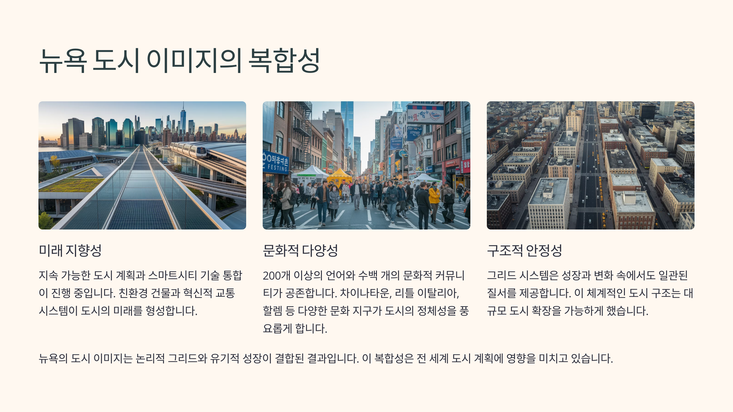 결절점에서는 타임스퀘어나 그랜드 센트럴처럼 시각과 기능이 집중된 장소가 도시의 흐름을 모아주고, 랜드마크들은 뉴욕을 하나의 강한 이미지로 각인시켜줘요. 이 모든 것이 결합되어, 뉴욕은 '읽을 수 있는 도시'에서 나아가 '기억되는 도시'가 되는 거예요.
