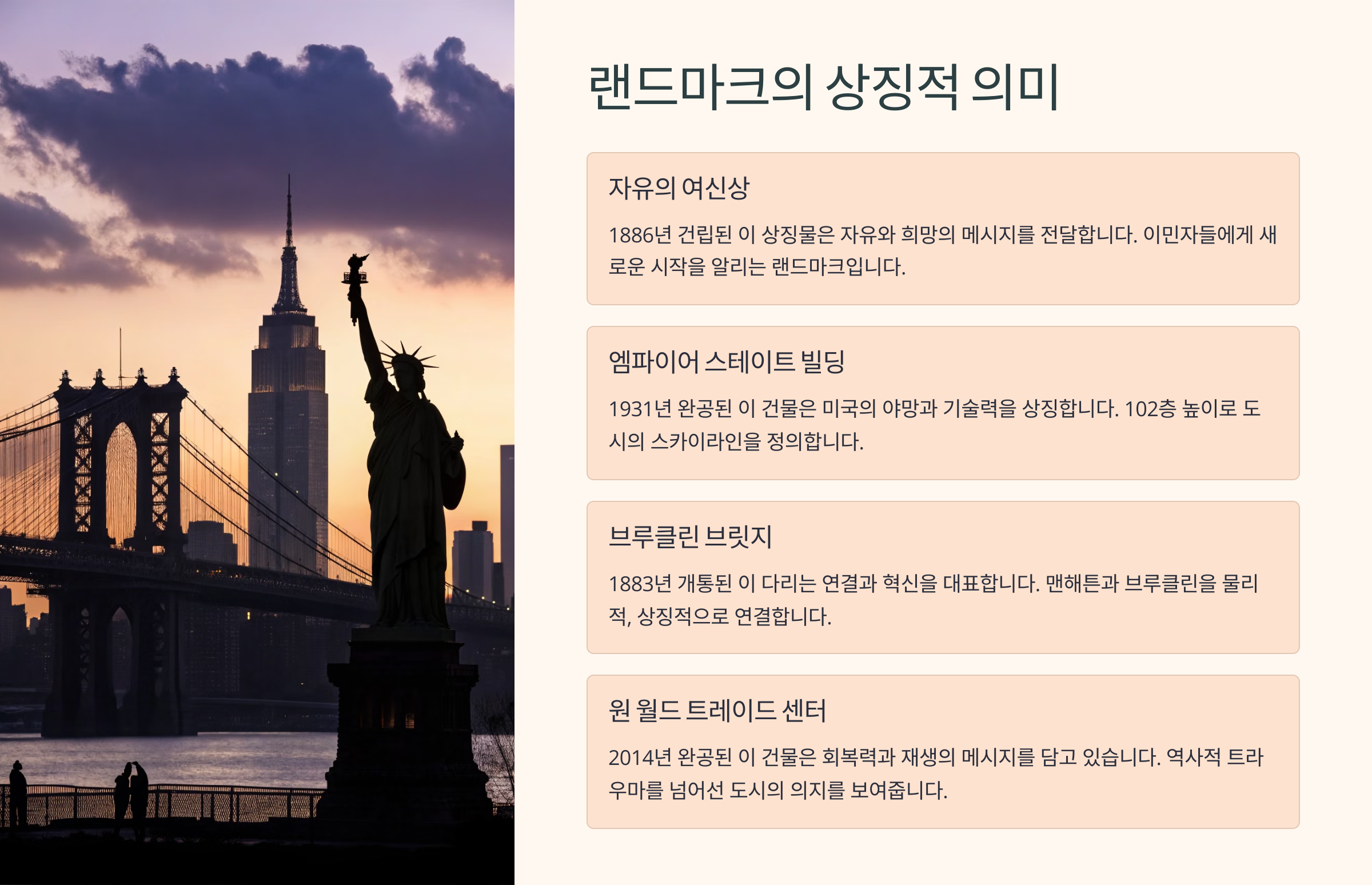 랜드마크는 도시를 대표하고, 방향을 인식하게 해주는 시각적 기준점이에요. 뉴욕은 세계에서 가장 많은 랜드마크가 모여 있는 도시 중 하나예요. 그중 가장 상징적인 랜드마크는 단연 자유의 여신상이에요. 미국의 상징이자 이민의 상징으로, 도시 정체성을 시각적으로 강하게 전달해요.