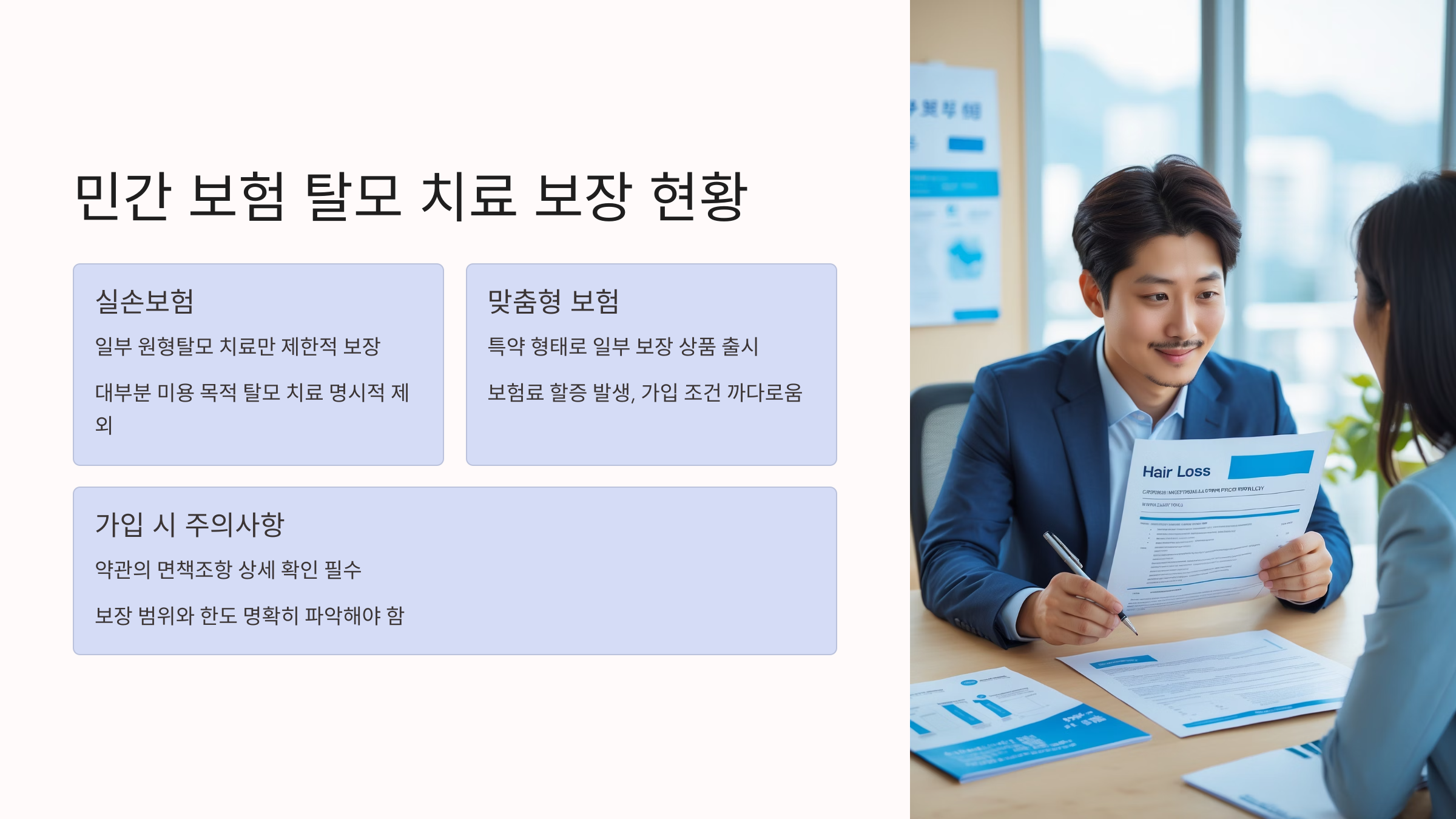 현재 탈모 치료는 공적 보험인 국민건강보험에서는 거의 보장받기 어렵기 때문에, 민간 실손보험이나 진단형 보험으로 보완하려는 분들도 많아요. 하지만 아쉽게도 대부분의 민간 보험 상품에서도 '탈모'는 보장 제외 항목에 포함되는 경우가 많아요.