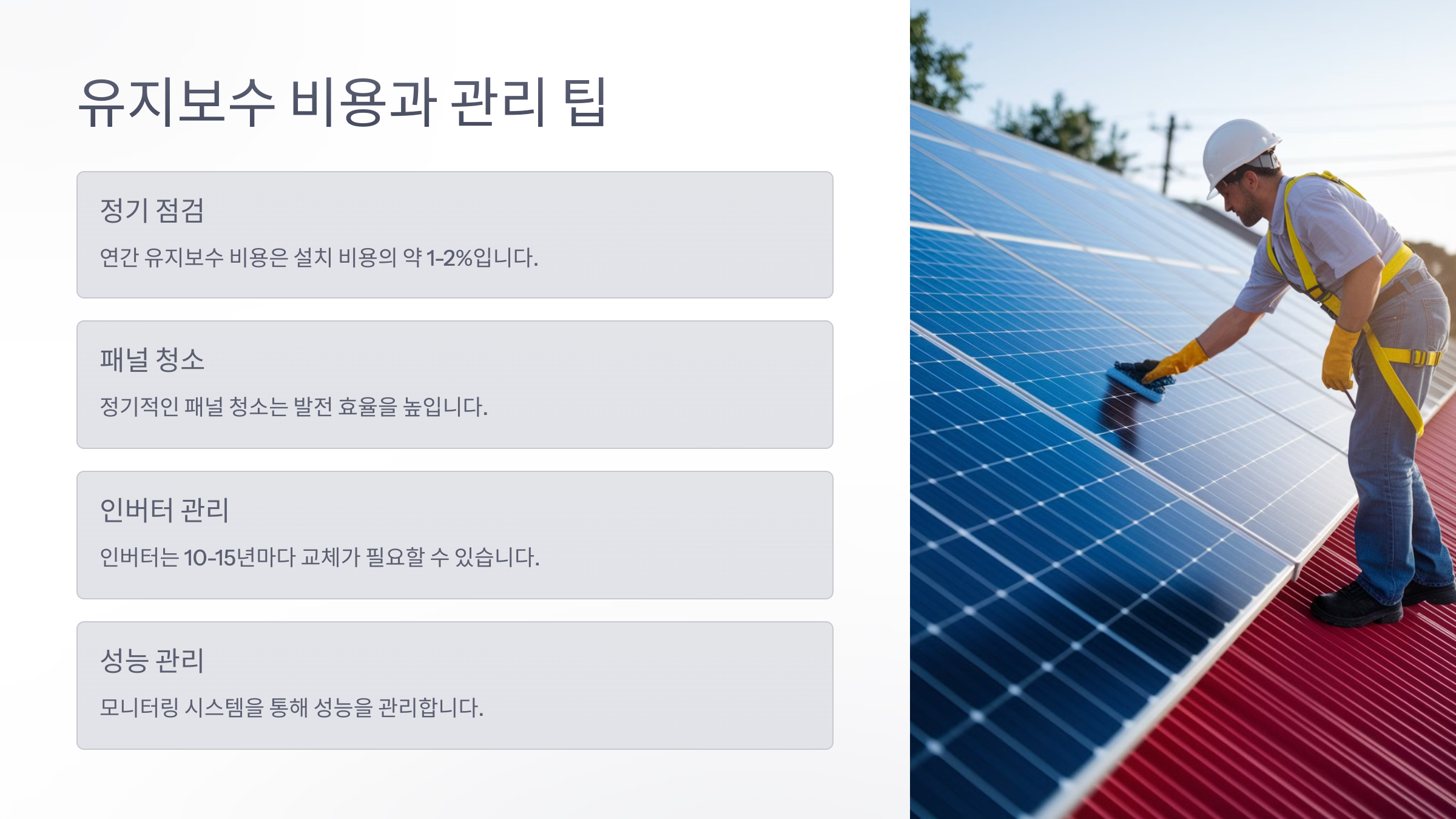 | 패널 청소 | 연 2~3회 | 10~30만 원/회 | 직접 또는 업체 의뢰 |