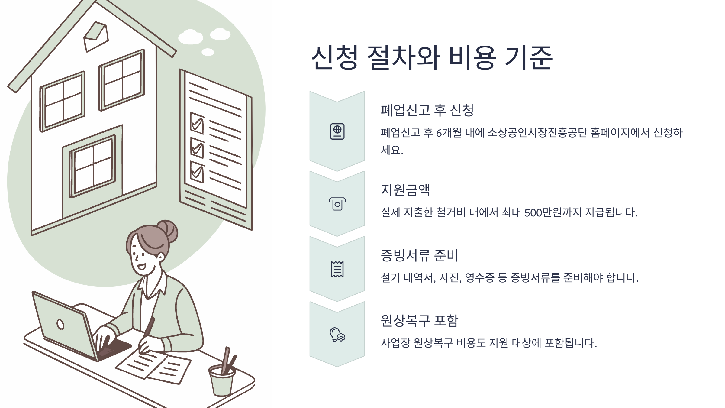 현장 방문이 필요한 경우에는 반드시 **신분증, 사업자등록 말소증명서, 임대차계약서, 철거 견적서 등**을 챙겨가야 해요. 원본 지참이 필요하며, 신청 후 약 2주~4주 정도 심사 기간이 걸릴 수 있어요.