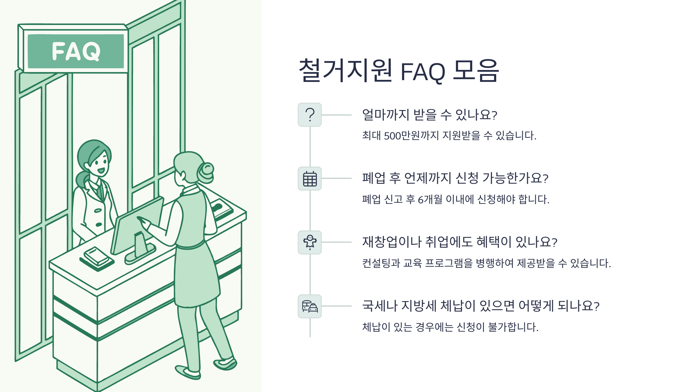 이 제도는 자발적 폐업뿐만 아니라, 경영상 어려움이나 권리금 분쟁으로 인한 강제 폐업 등 다양한 사유에 대해 적용될 수 있어요. 다만, 폐업 사실을 먼저 신고하고 사업자등록 말소가 완료된 상태여야 해요.