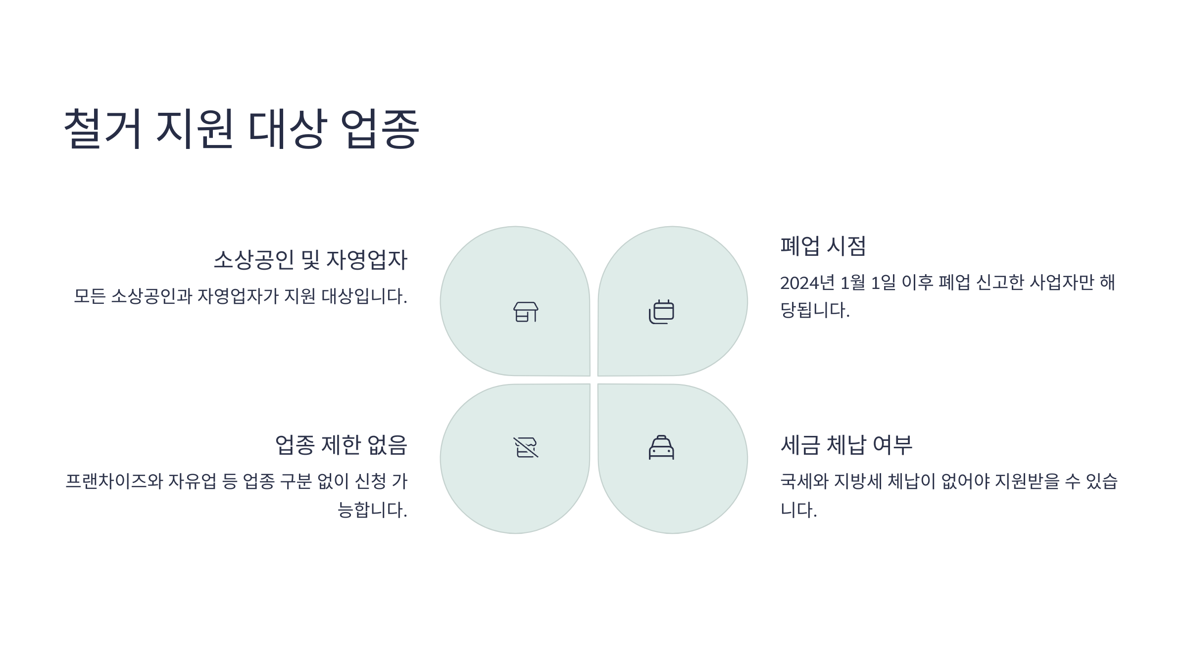 반면 **대기업 프랜차이즈 직영점, 온라인 전자상거래 업체, 무점포 사업자, 배달 플랫폼 전용 창업자 등은 대상에서 제외**될 수 있어요. 특히 무점포 통신판매업자는 철거할 점포가 없기 때문에 기본 조건에서 제외돼요.