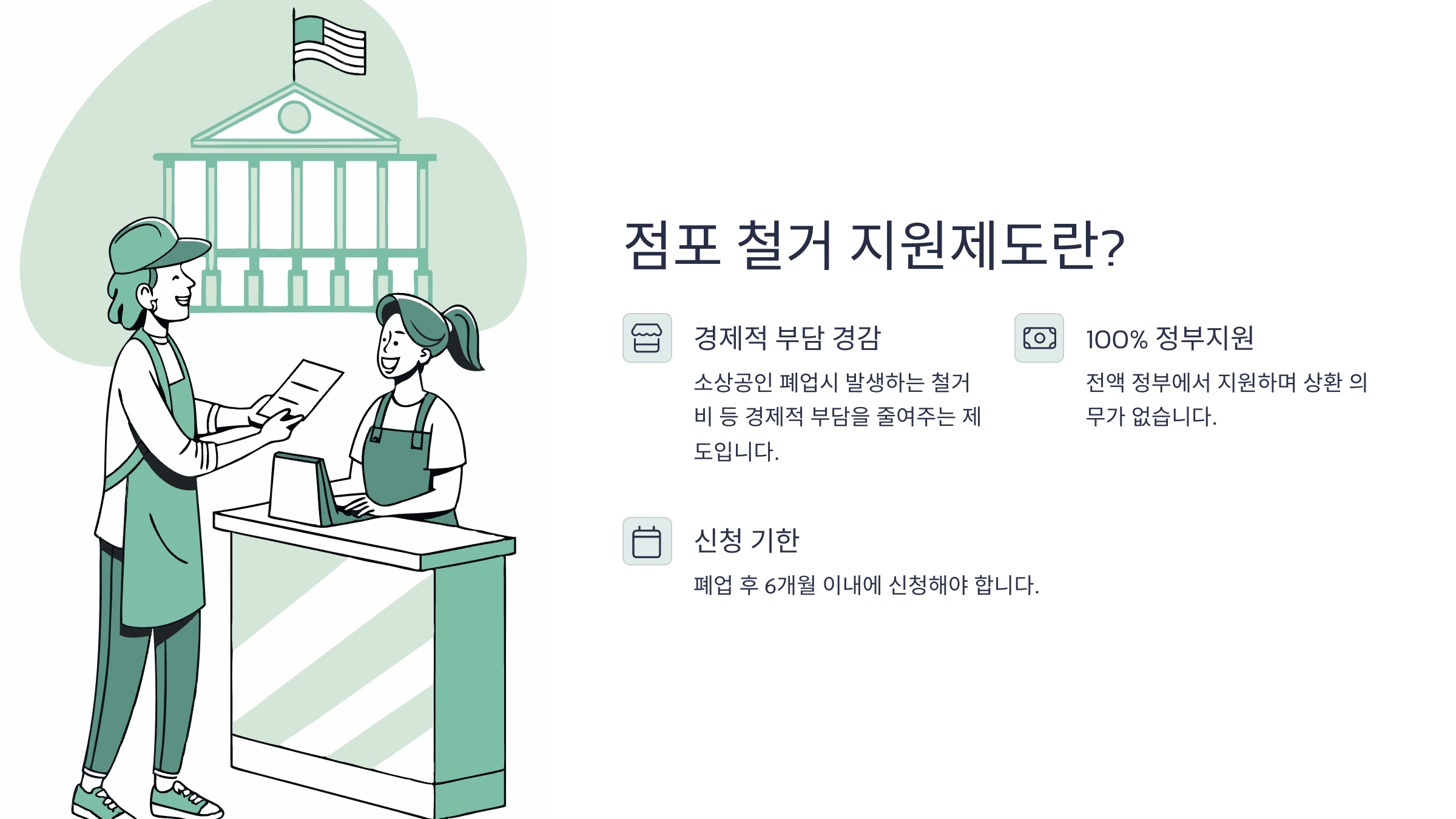 이 제도는 자영업자의 폐업 부담을 줄이고, 원활한 재기를 돕기 위한 목적으로 마련됐어요. 특히 임대 건물에 입점한 점포일 경우, 계약상 원상복구 의무가 있는 경우가 많기 때문에 이 철거 지원금은 정말 실속 있는 혜택이에요.💡
