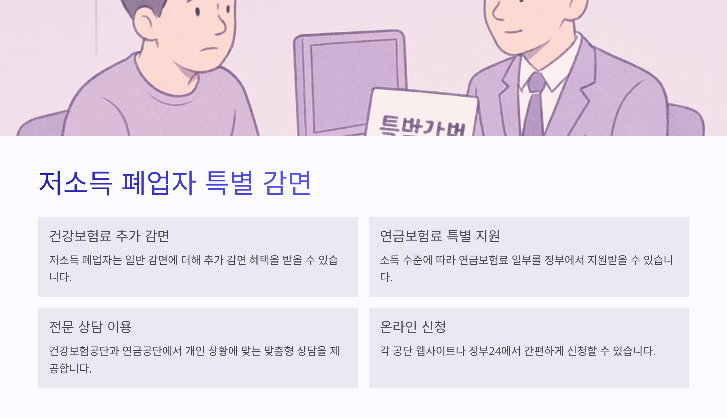 폐업 후 소득이 거의 없거나 기초생활이 어려운 경우에는 건강보험과 국민연금 모두 ‘특별 감면제도’를 활용할 수 있어요. 이 제도는 기존의 일반 경감제도보다 훨씬 더 큰 폭의 할인 혜택을 제공해요.