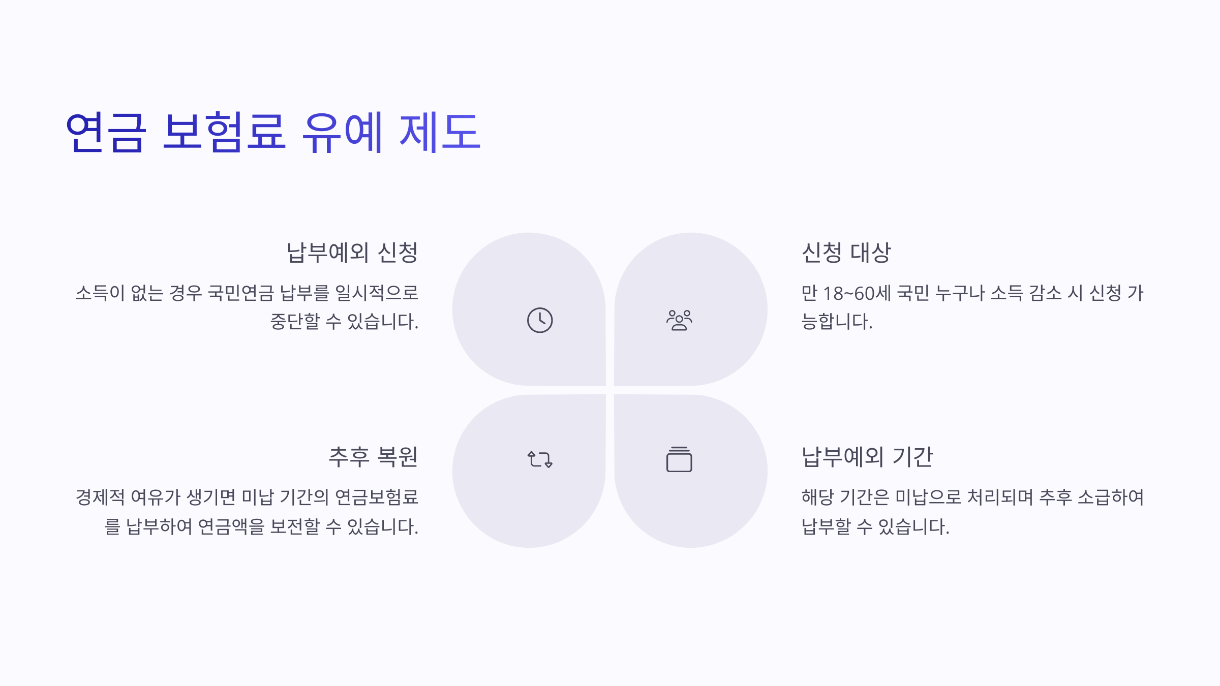 폐업 후 수입이 줄거나 소득이 없을 경우 국민연금 보험료 납부가 큰 부담이 될 수 있어요. 이럴 땐 납부예외(유예) 제도를 활용하면 도움이 돼요. 일정 기간 동안 연금 보험료를 내지 않아도 자격을 유지할 수 있는 제도랍니다.