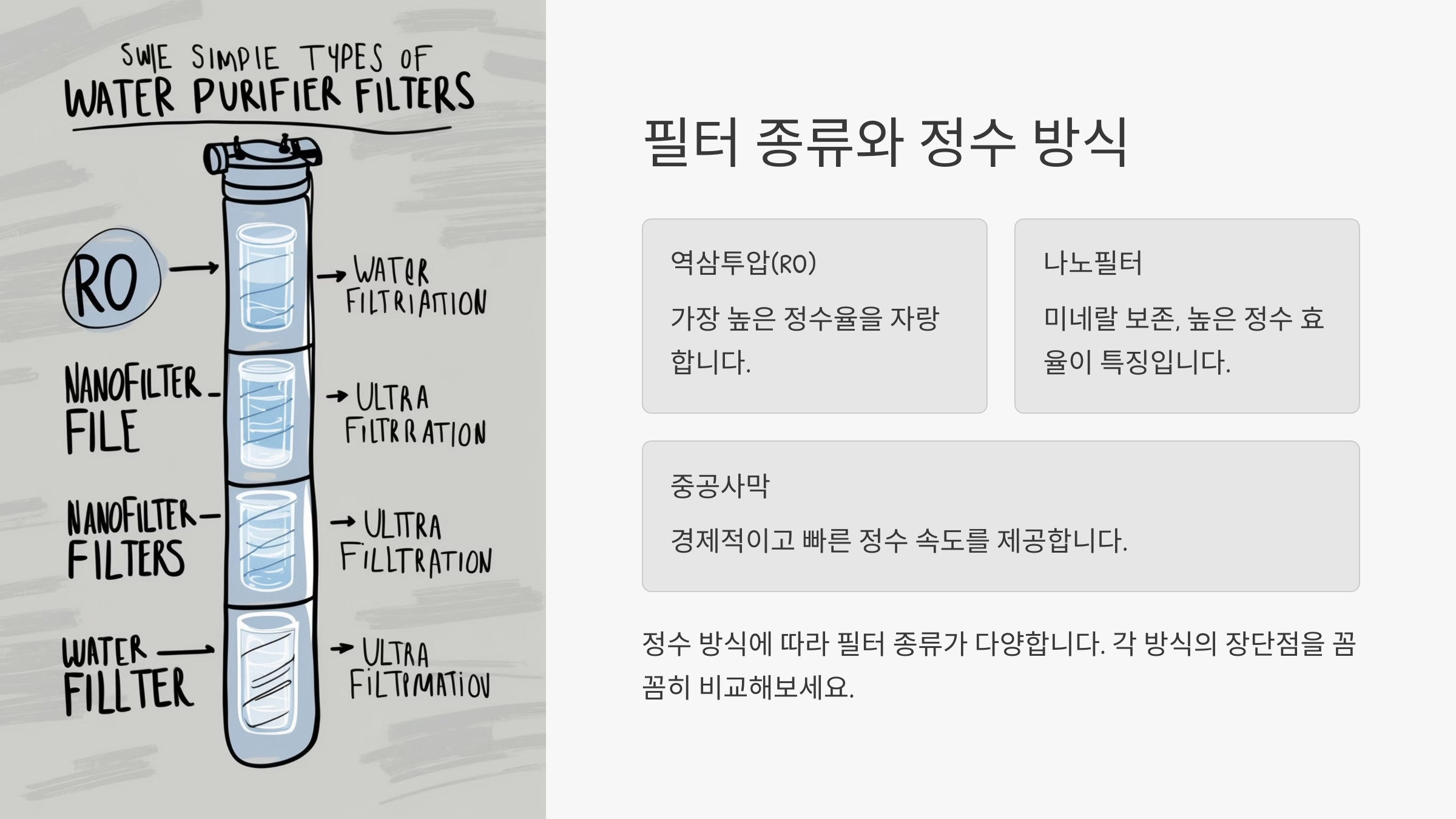 정수기의 핵심은 **필터 성능**이에요. 어떤 필터를 사용하는지에 따라 정수 효과가 달라지죠! 🚰