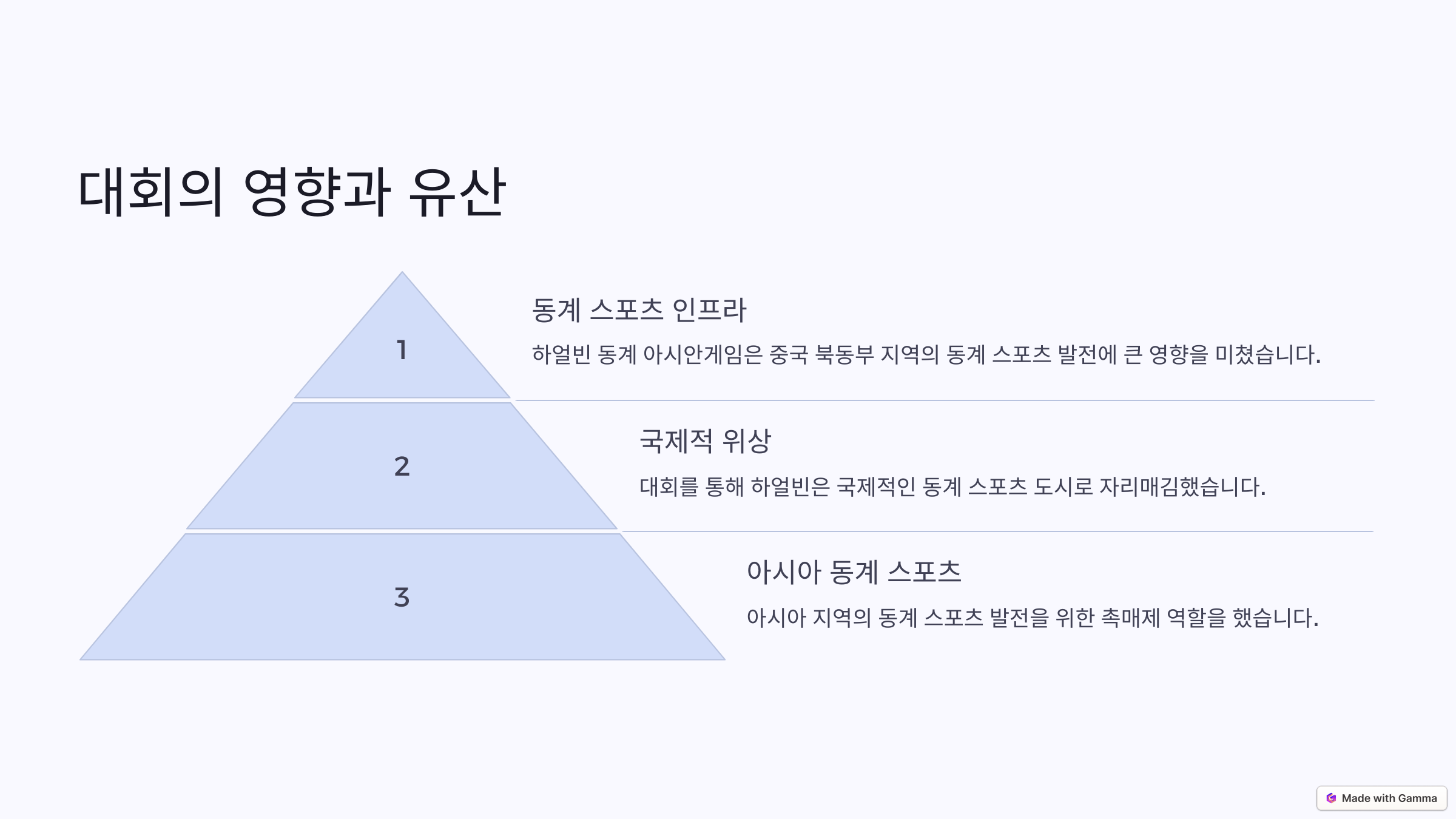 하얼빈 동계 아시안게임은 아시아 동계 스포츠 발전에 중요한 전환점이 되었어요. 대회를 통해 아시아 각국은 동계 스포츠에 대한 관심을 높였고, 동계 종목의 저변 확대에 기여했답니다.