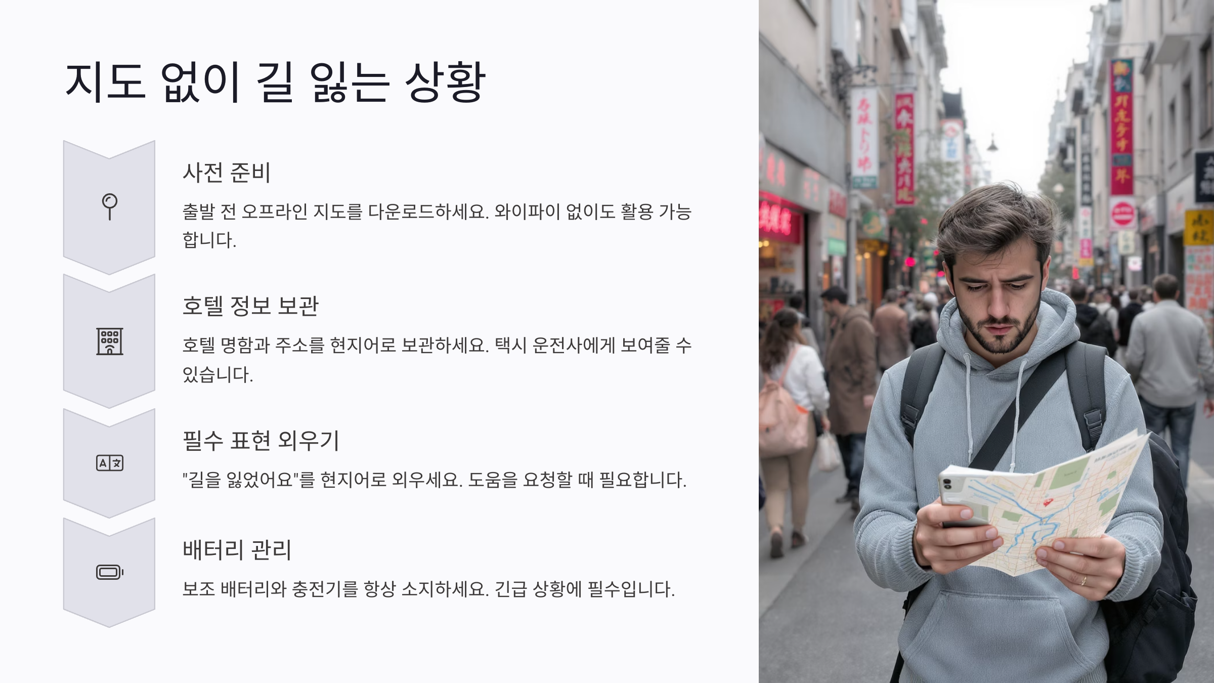 요즘은 스마트폰 덕분에 지도를 쉽게 볼 수 있어서 길을 잃을 일이 적어졌지만, 인터넷이 안 되거나 배터리가 꺼졌을 때는 상황이 달라져요. 해외에서 낯선 도시 한복판에서 위치도 모르고 방황하는 건 정말 무서운 일이에요. 특히 밤이거나 치안이 불안한 지역이라면 더 조심해야 해요.