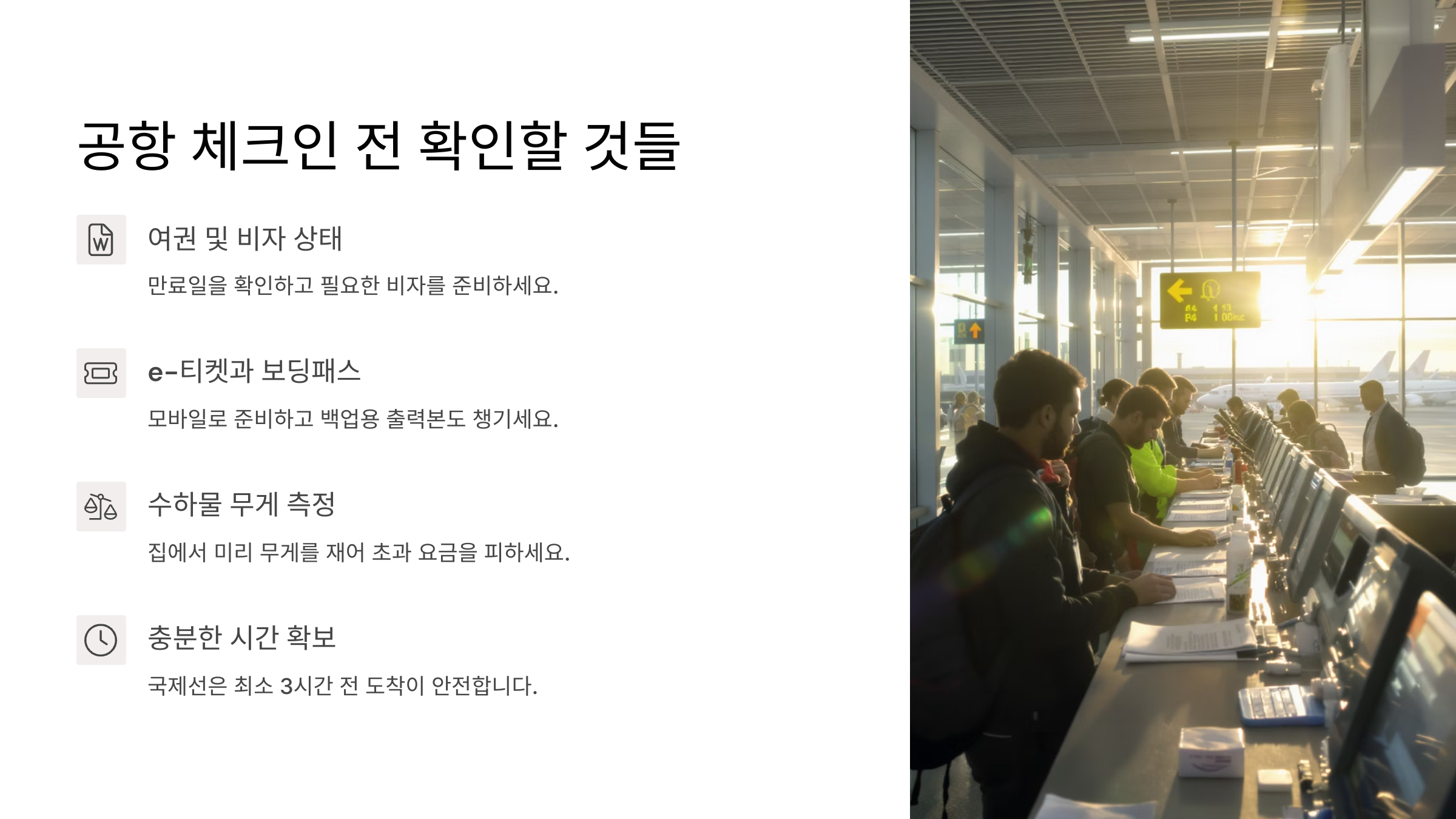 체크인은 단순히 줄 서서 티켓 받는 일이 아니에요. 출국 당일 공항에 도착해서 해야 할 일은 생각보다 많고, 하나라도 빠지면 비행기를 놓칠 수도 있어요! 😰