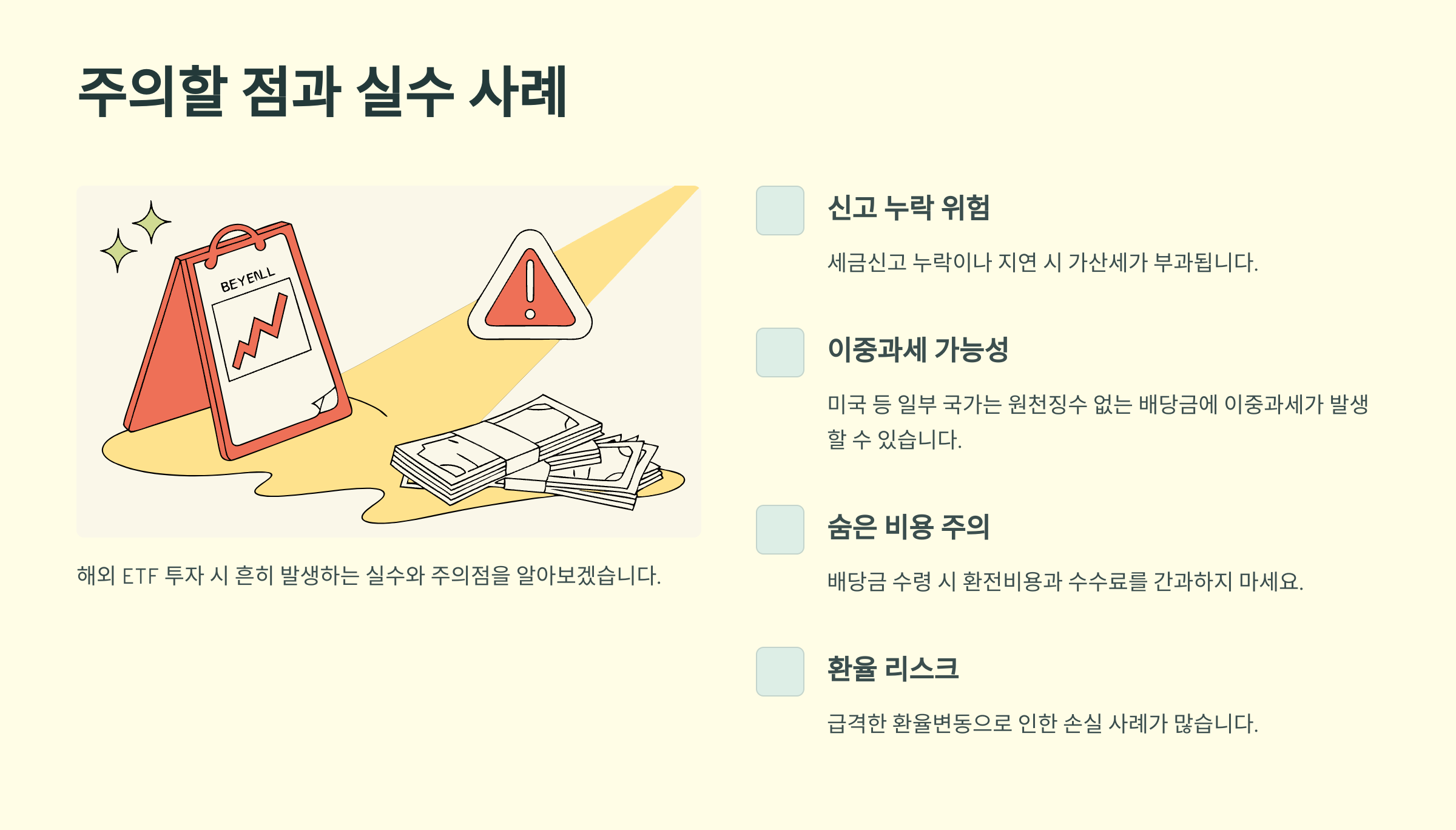 ❌ 국내 ETF와 헷갈려서 신고 자체를 안 하는 경우도 많아요. 미국 상장 ETF는 반드시 홈택스 자진신고가 필요하다는 걸 기억하세요! 🧠