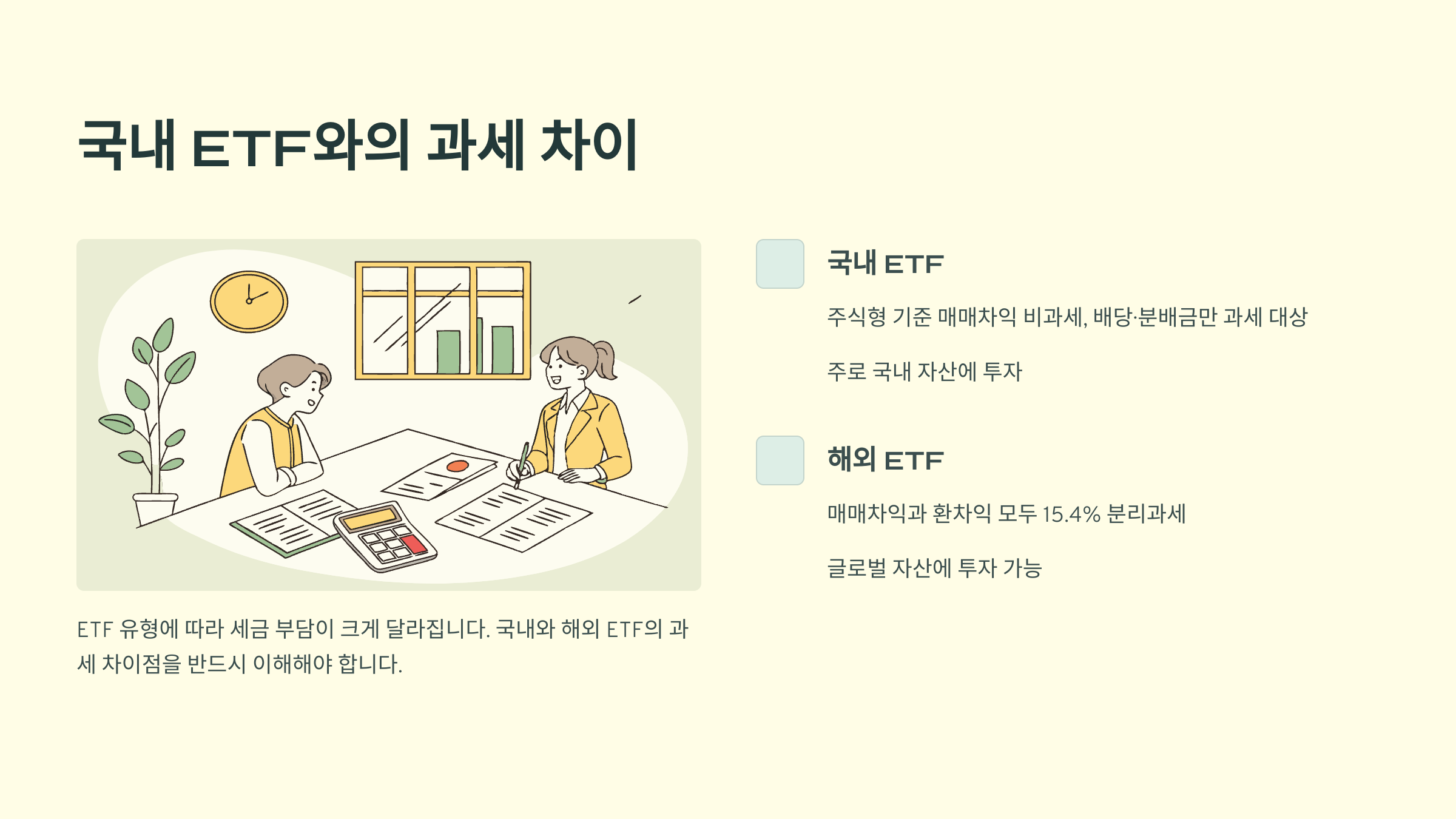 A2. 과세 방식이 달라요. 국내 ETF는 배당소득세, 해외 ETF는 양도소득세 + 배당소득세로 따로 계산돼요.