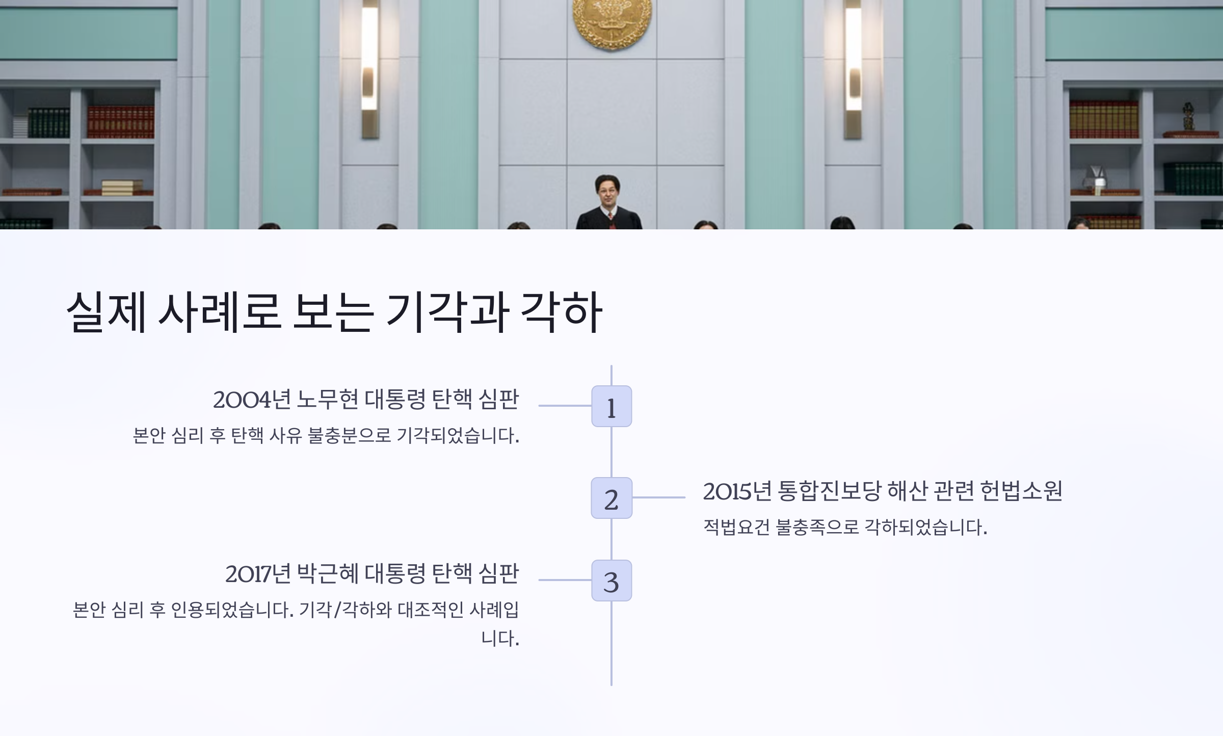 예를 들어 2004년 탄핵심판 사건에서 헌법재판소는 당시 대통령에 대한 탄핵소추를 "기각"했어요. 이 말은 헌재가 사건의 실체, 즉 헌법이나 법률 위반 여부를 판단했고, 그 결과로 "탄핵 사유가 없다"고 결론 내렸다는 뜻이에요. 내용은 다뤘지만 탄핵은 받아들이지 않은 것이죠.
