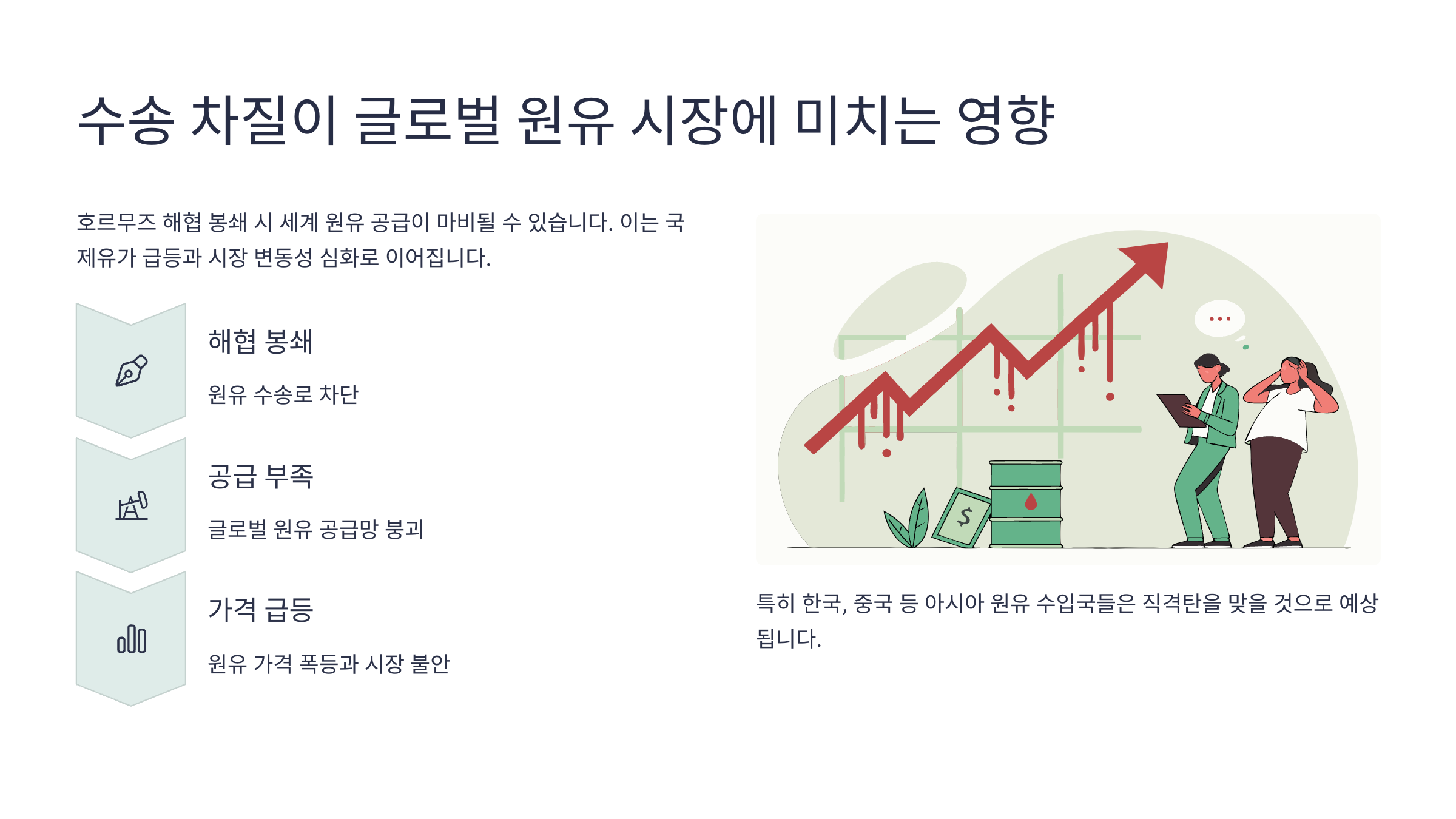 한국은 원유 수입의 70% 이상을 중동에 의존하고 있기 때문에, 단가 상승은 제조업 원가 상승으로 이어지고, 이는 국내 경제에도 영향을 줄 수 있어요. 반면, 관련 테마주엔 호재가 될 수 있죠 😎
