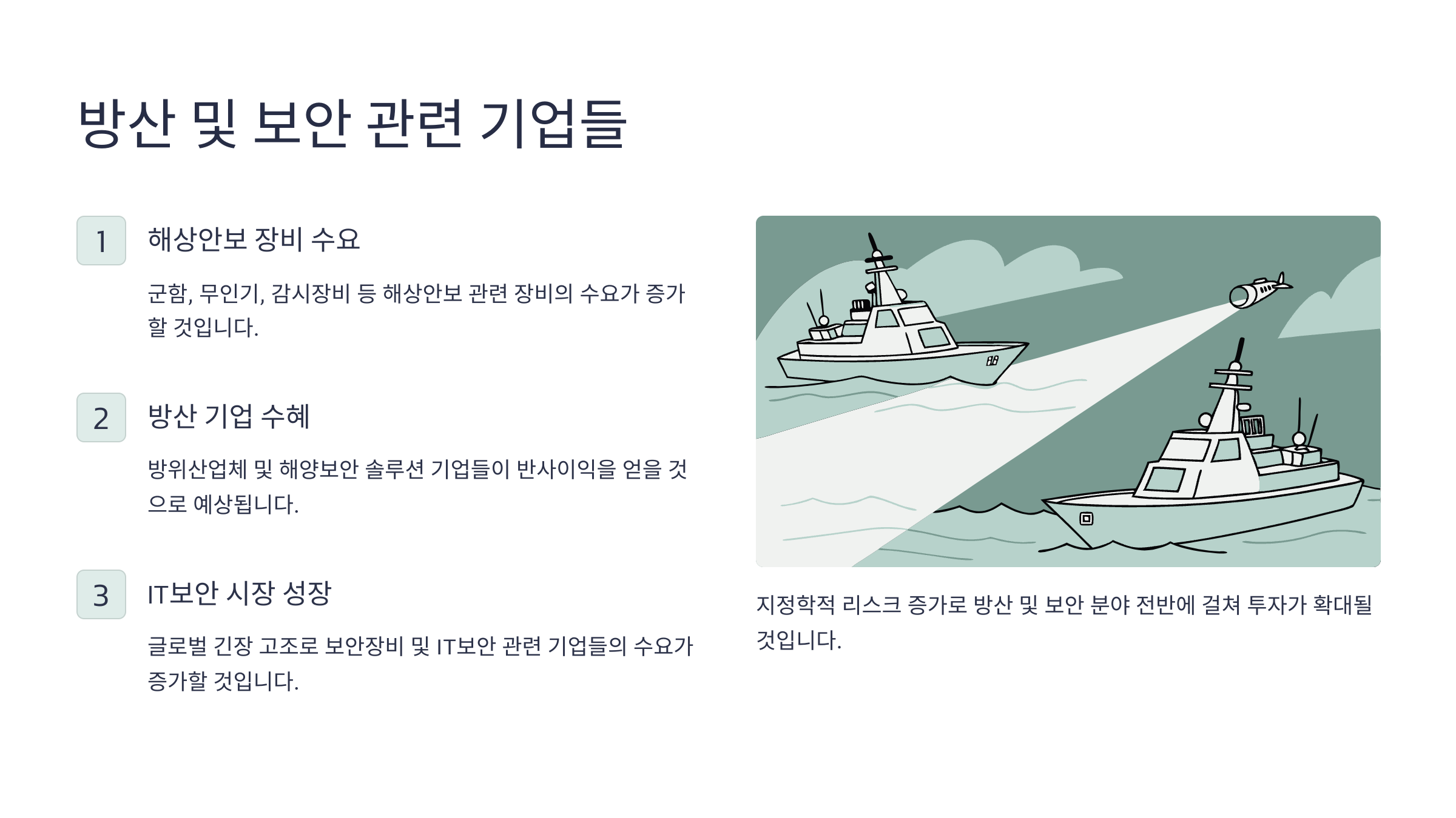 호르무즈 해협이 군사적 갈등의 무대가 되면 단순한 원유 수송 문제가 아니라 국제 안보 이슈로 번지게 돼요. 이럴 때 부각되는 업종이 바로 방산과 보안 관련주예요. 위험이 고조되면 국방 강화, 정보 보안, 사이버 대응 등이 핵심 키워드로 떠오르죠.