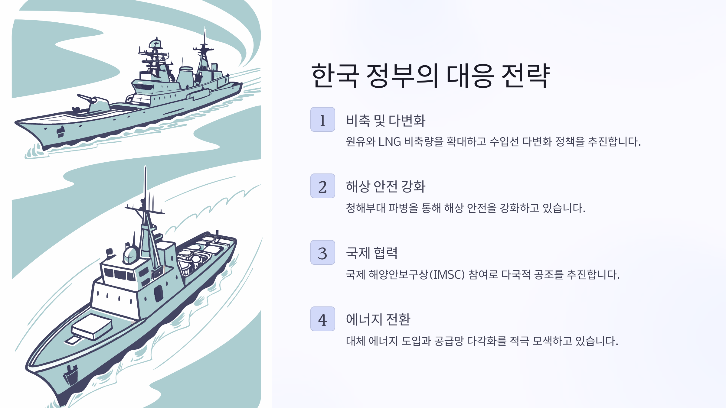 군사적 대응도 있어요. 2020년 이후 한국은 청해부대를 호르무즈 인근 해역으로 파병한 전례가 있고, 위기 발생 시 민간 선박 보호를 위한 작전도 병행해요. 국제 사회와 연합하여 해상 안전을 확보하고, 우리 선박의 항해 자유를 보장하려는 노력이죠.