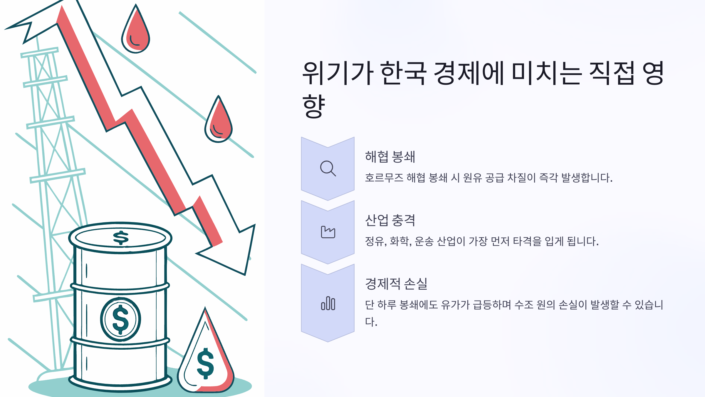 호르무즈 해협에서 위기가 발생하면 가장 먼저 반응하는 곳은 국제 원유 시장이에요. 불안정성이 커지면 유가가 오르고, 이 여파는 고스란히 한국 경제에 전이돼요. 특히 우리는 원유 수입 비중이 높고, 에너지 가격이 산업 구조 전반에 영향을 미치기 때문에 원가 상승의 충격이 빠르게 확산되죠.