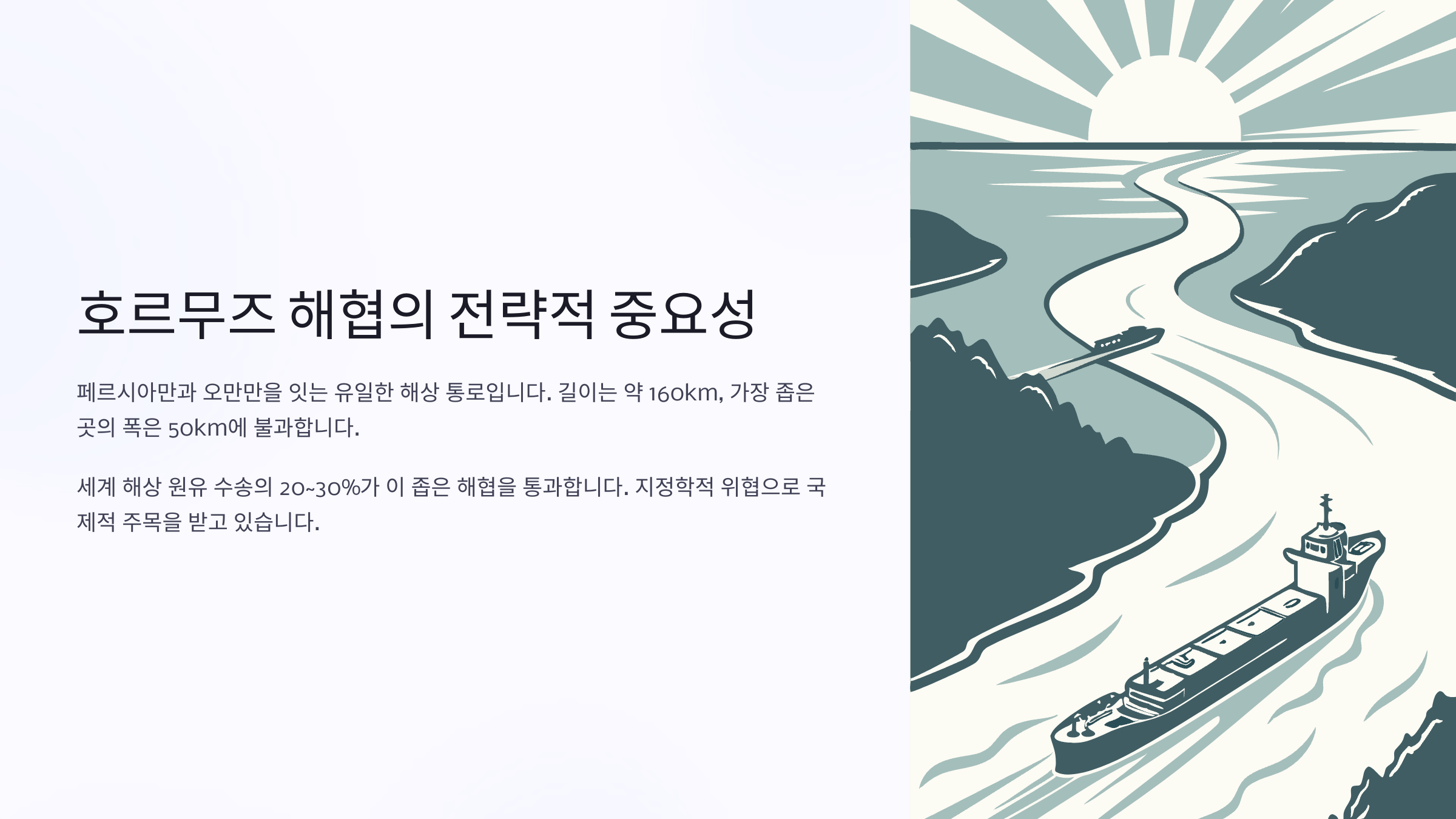 이처럼 호르무즈 해협은 단순한 수로가 아니라, 전 세계 에너지와 산업 자원을 실어나르는 '에너지 대동맥'이에요. 한국 역시 이 해협을 경유한 자원 수입에 크게 의존하고 있어서, 여기에서 발생하는 안보 리스크는 곧바로 경제 리스크로 전이될 수밖에 없어요.