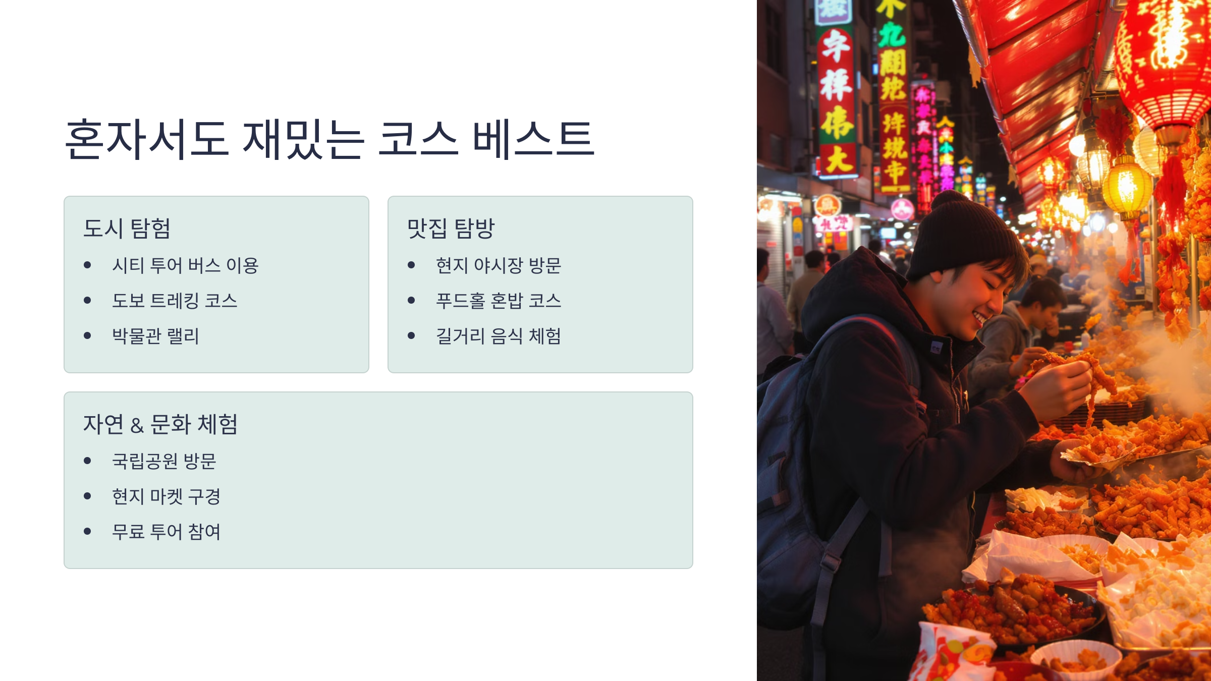 🏙️ 혼자 여행에 좋은 코스 추천표