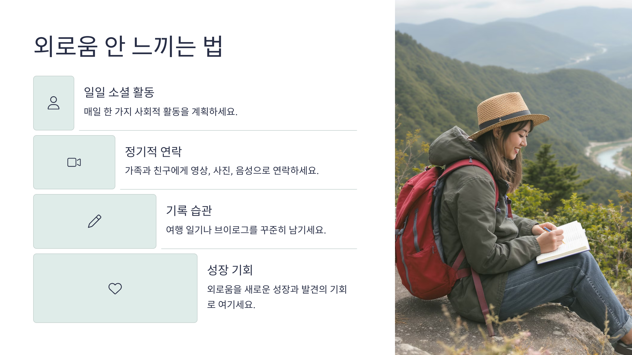 | 여행 일기 쓰기 | 감정 정리, 추억 보관 | 하루 마무리 루틴으로 딱 |