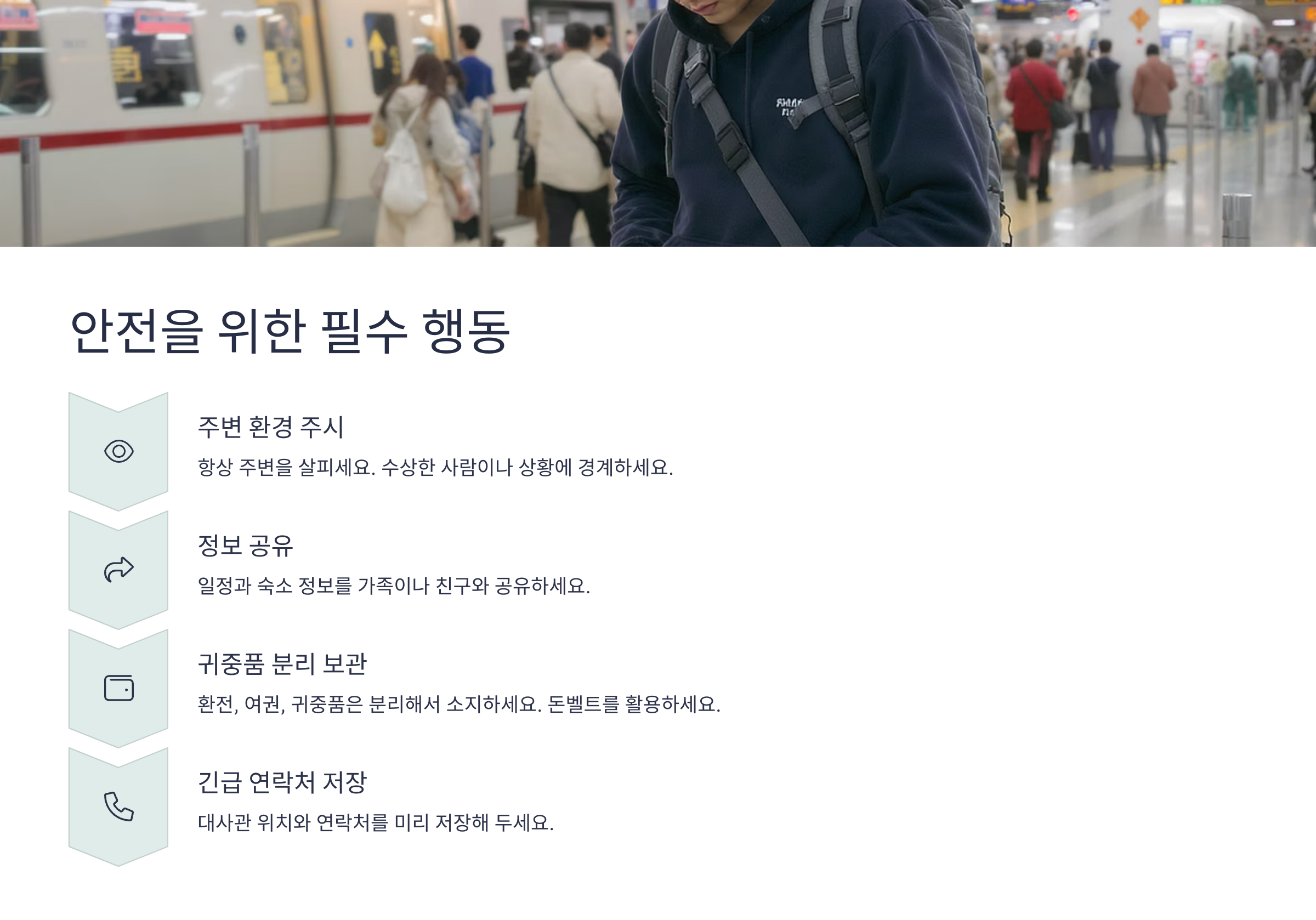 혼자 해외여행을 떠날 때 가장 중요한 건 바로 ‘안전’이에요. 아무리 재밌는 일정이라도 위험에 노출된다면 여행이 망가질 수 있어요. 혼자라는 사실을 잊지 말고, 작은 습관 하나까지 안전을 중심에 두는 게 중요해요. 🧭