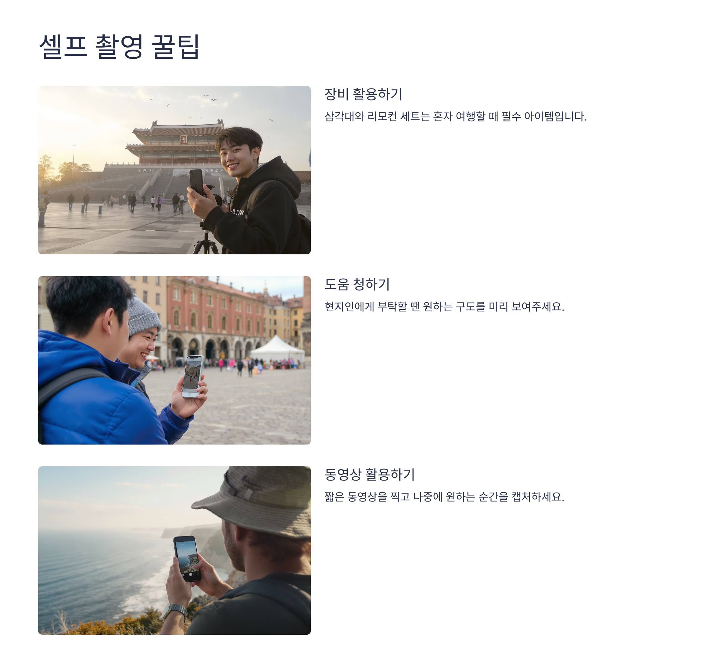 혼자 여행을 하다 보면 사진 찍을 사람이 없어 아쉽다는 분들 많아요. 하지만 요즘은 삼각대와 리모컨, 타이머 촬영 등 혼자서도 멋진 여행 사진을 남길 수 있는 방법이 다양하답니다! 💁♂️