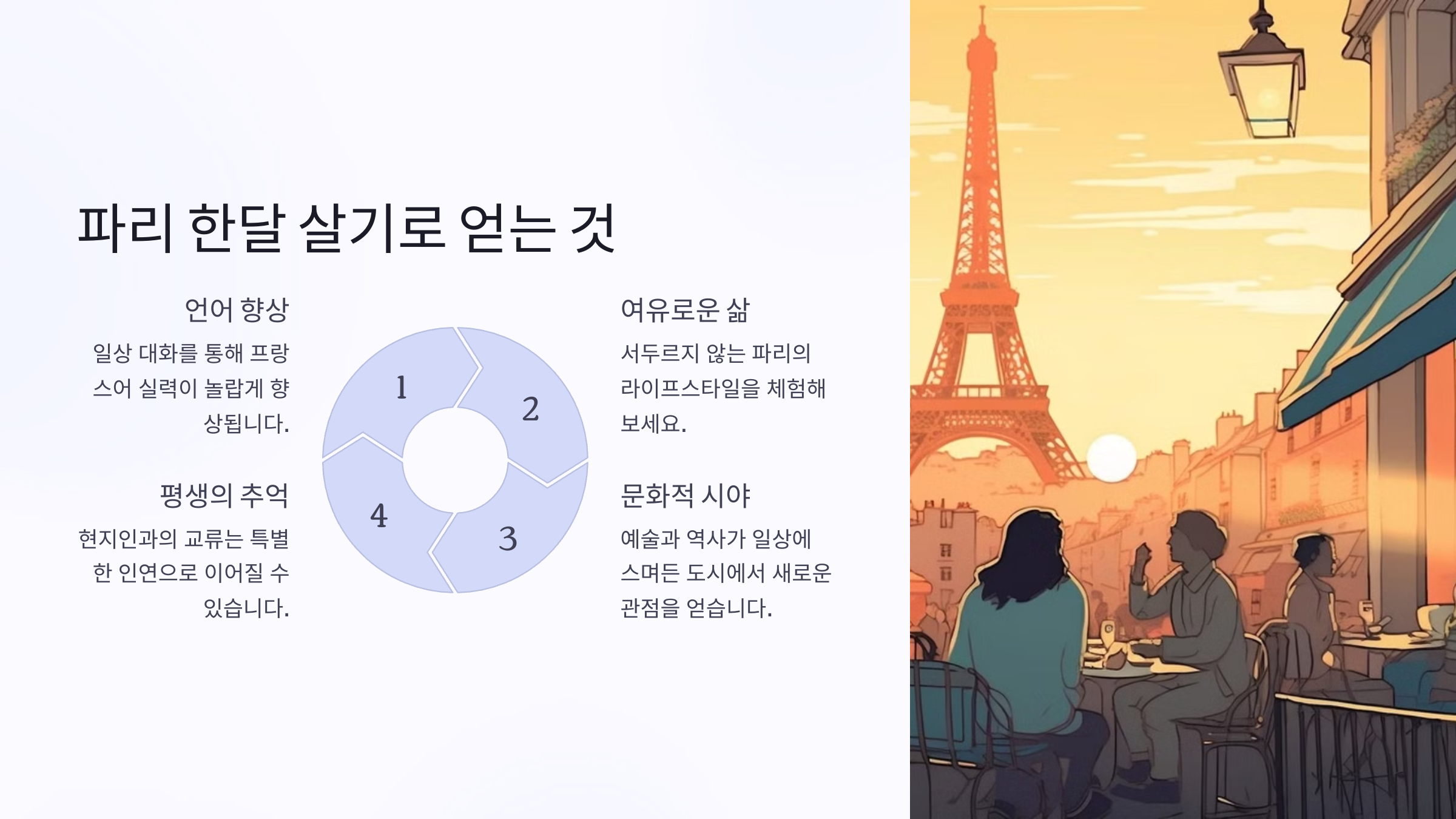 | 여유로운 생활 | 관광객의 바쁜 일정 없이 천천히 즐기기 | 파리의 진짜 매력을 발견할 수 있어요 |