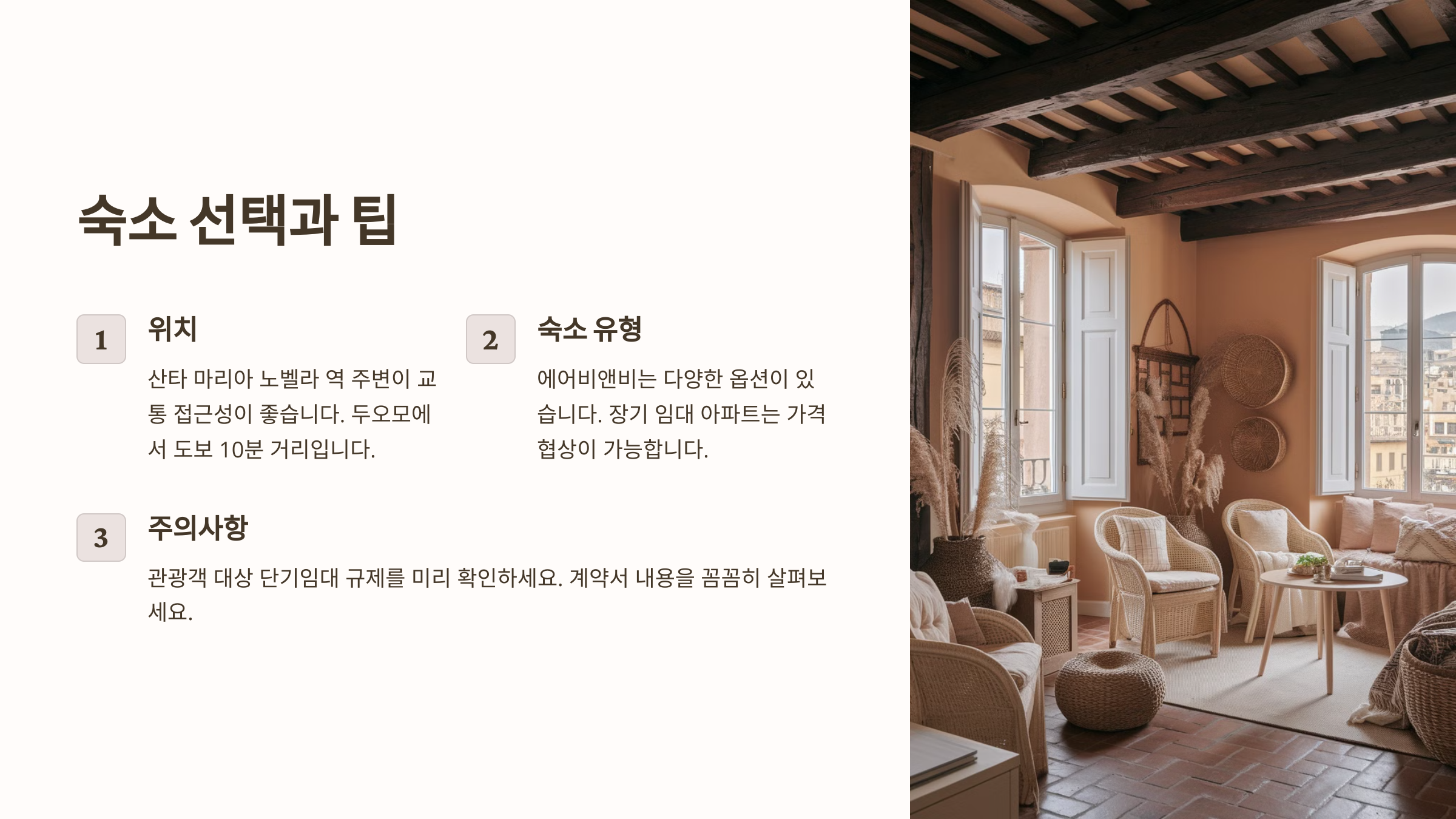 이제, 피렌체에서 한 달 동안 머물 숙소를 어떻게 선택하면 좋을지 알아볼까요? 🏡