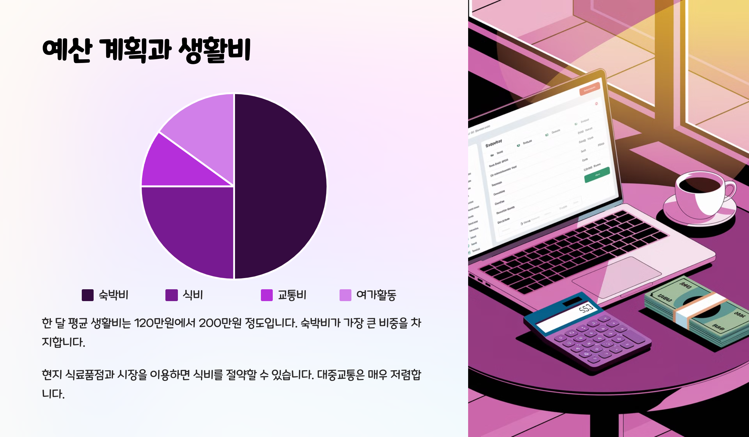 🏠 숙소 비용: 숙소는 예산에 따라 크게 달라져요. 시내 중심의 아파트는 비싸지만 외곽 지역은 더 저렴해요.