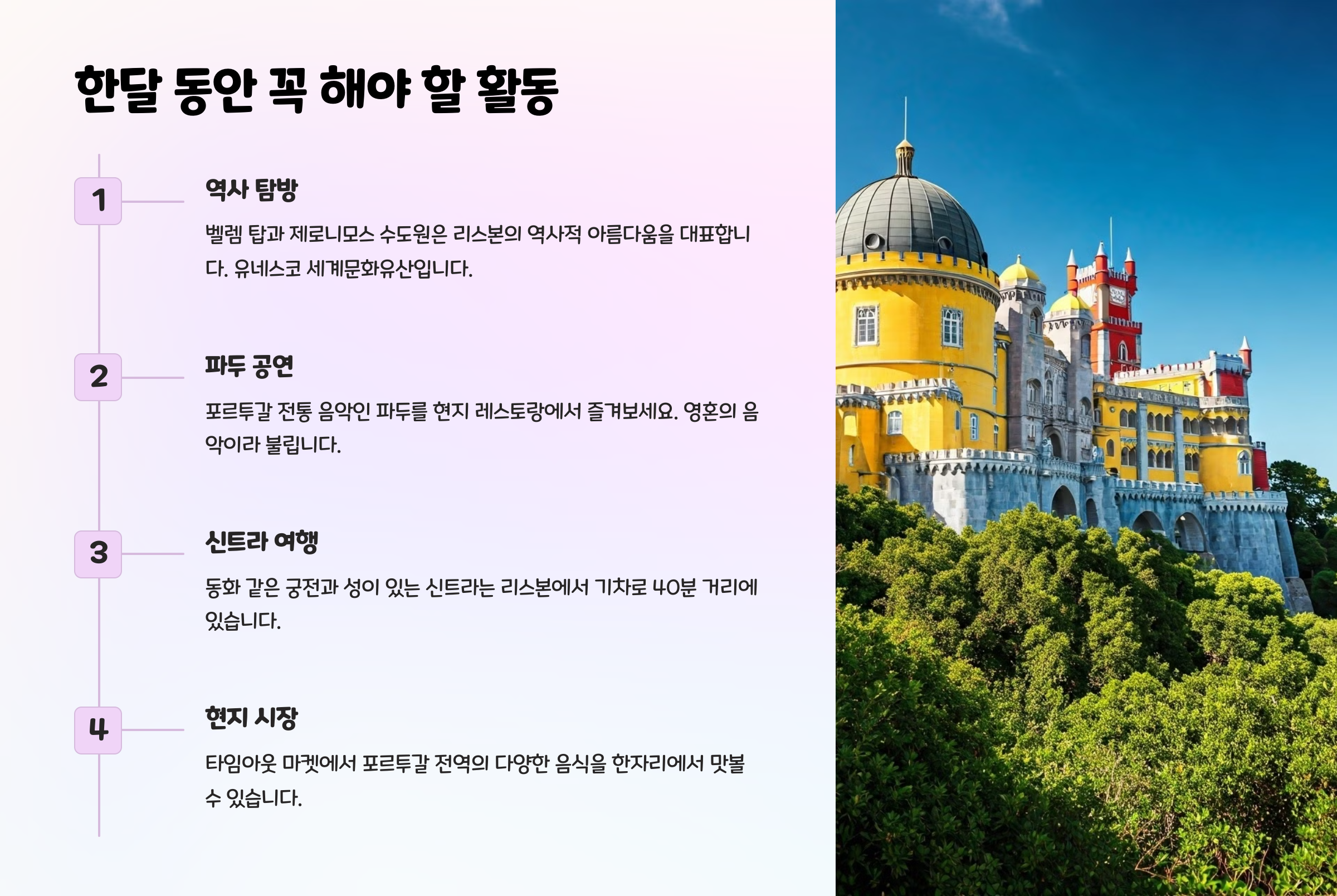 리스본은 한 달 동안 머무르며 예술, 음악, 자연, 역사를 모두 경험할 수 있는 도시예요. 단순한 관광이 아니라, 현지인처럼 여유롭게 살아보는 것이 가장 큰 매력이죠!
