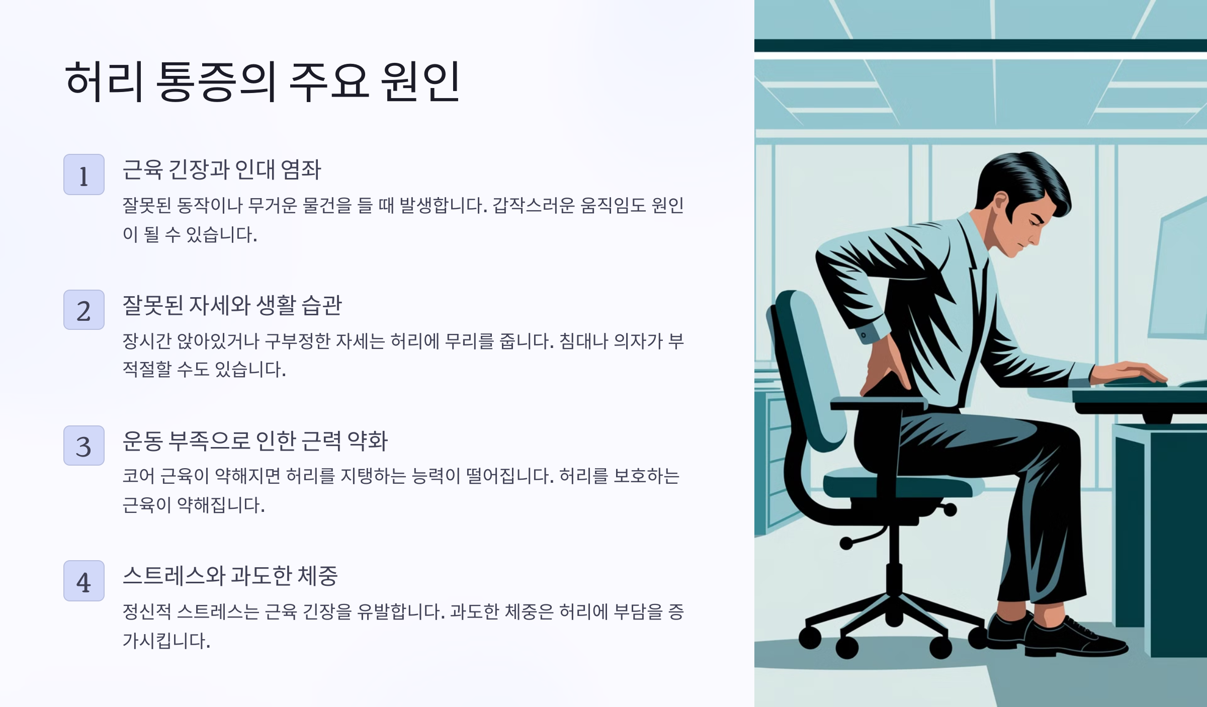 아래에서 본격적으로 허리 통증의 원인과 해결 방법을 알아볼까요? 😊