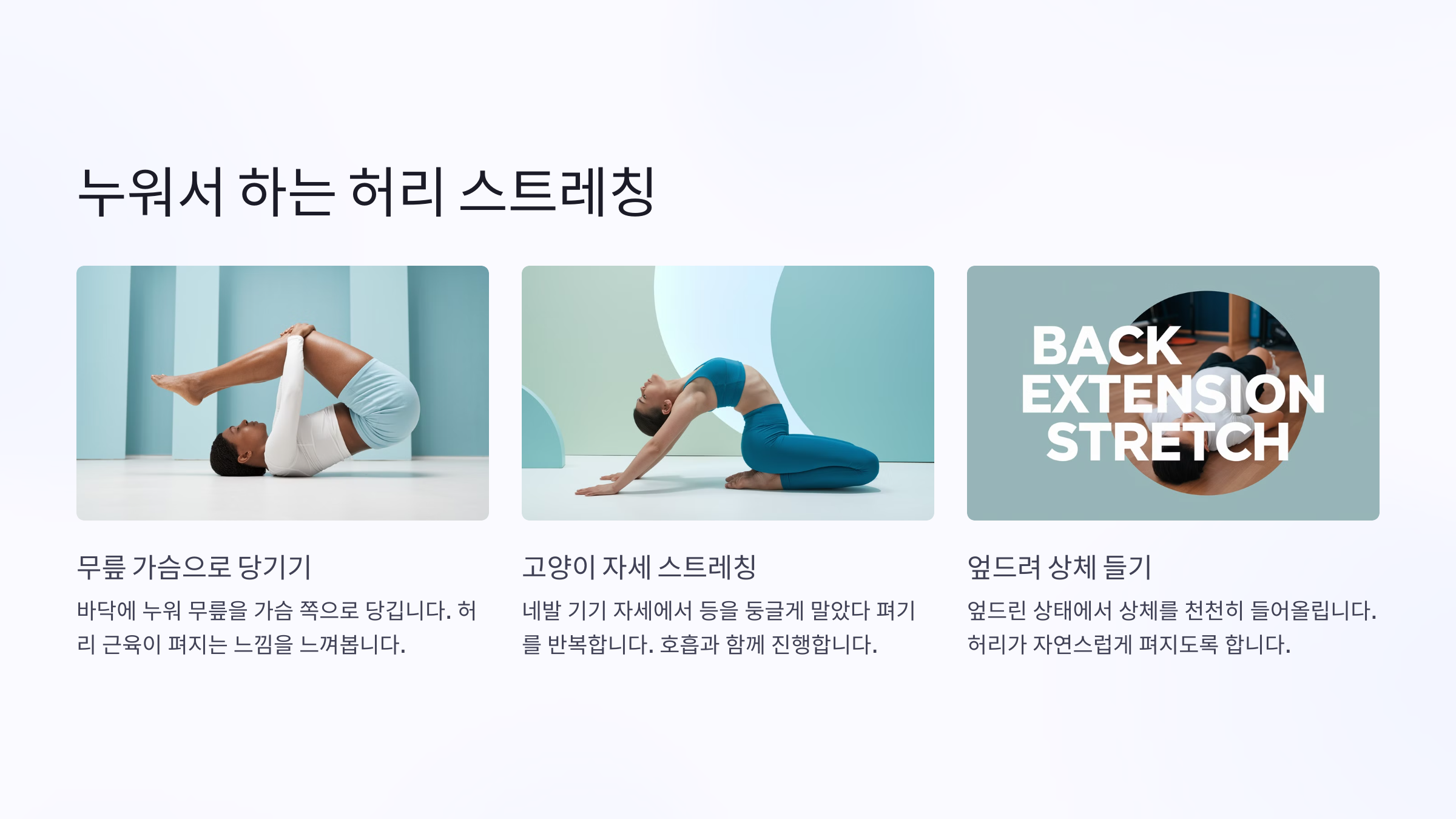 ✔ 일정한 루틴 유지하기 스트레칭은 하루 이틀 한다고 효과를 보는 것이 아니에요. 매일 꾸준히 해야 허리 건강이 개선될 수 있어요.