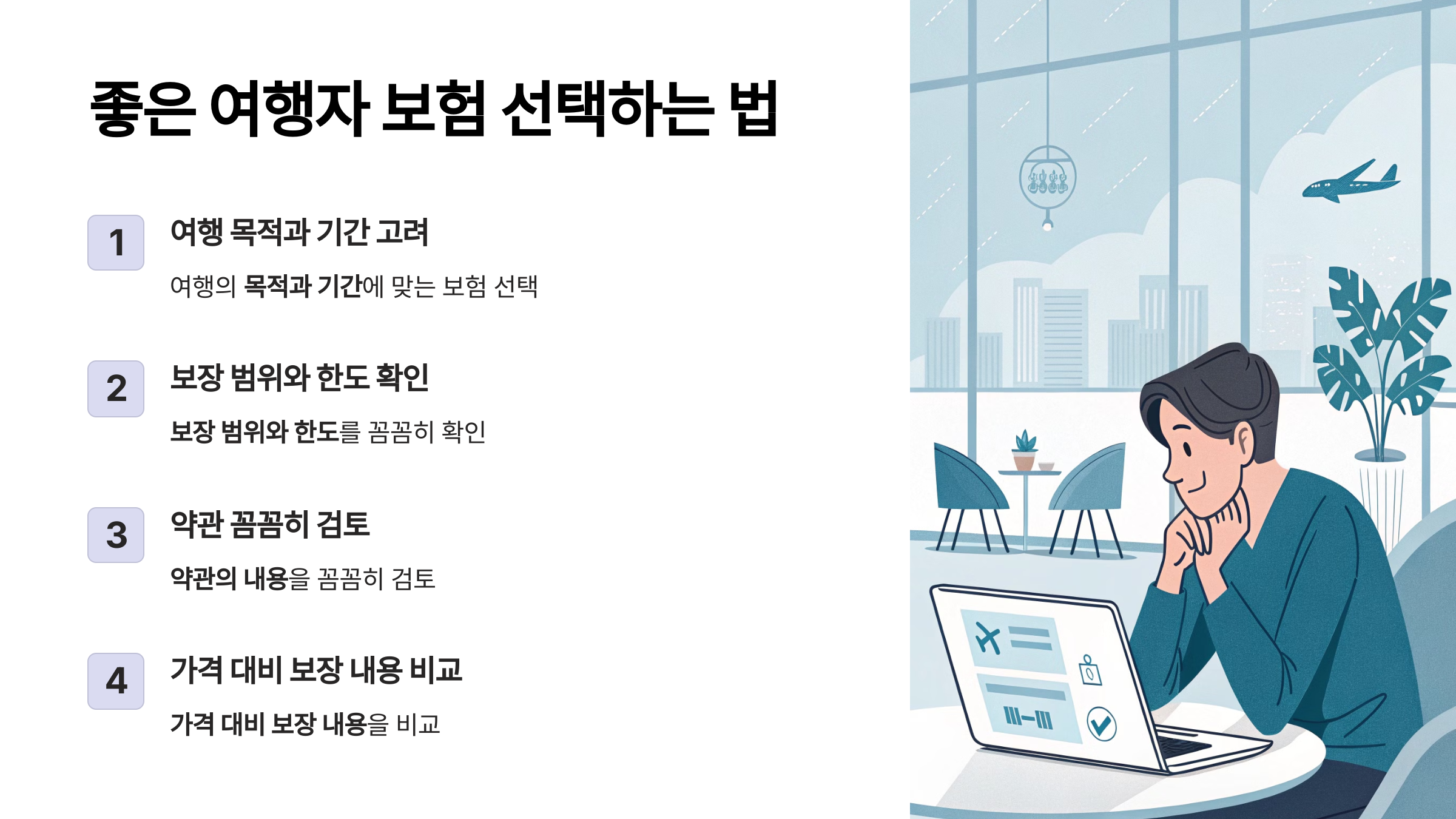 보험의 종류를 알았다면, 이제 **좋은 여행자 보험을 고르는 방법**을 알아볼까요? 🤔