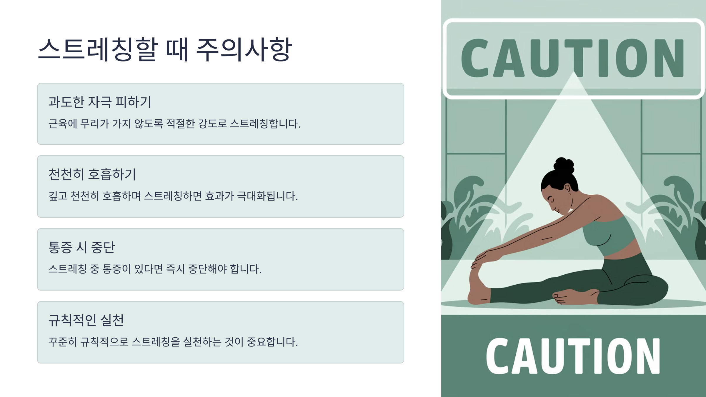 이제 허리가 한결 가벼워진 느낌이 들 거예요! 😆 마지막으로 스트레칭할 때 주의해야 할 사항을 알아볼까요?