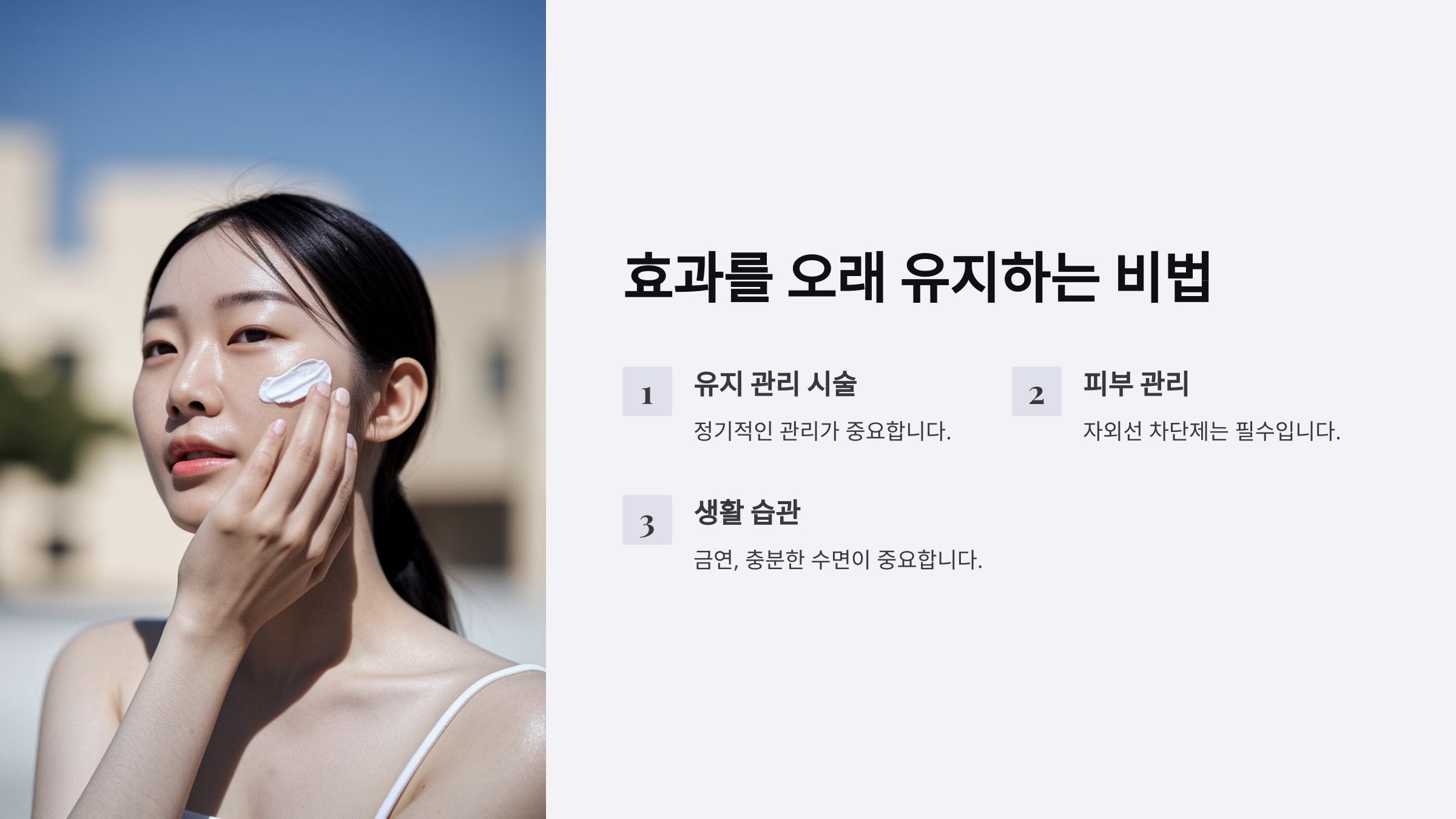 | 강한 햇빛 피하기 | 시술 후 2주간 자외선 차단 필수, 실내에서도 자외선 차단제 사용 |