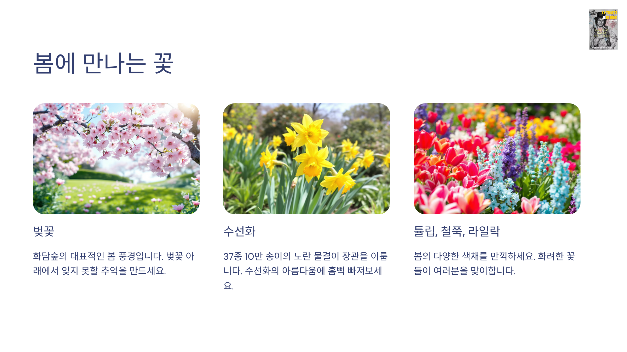 | 벚꽃 | 4월 초~4월 중순 | 화려한 분홍빛, 바람에 흩날리는 모습이 매력적 |