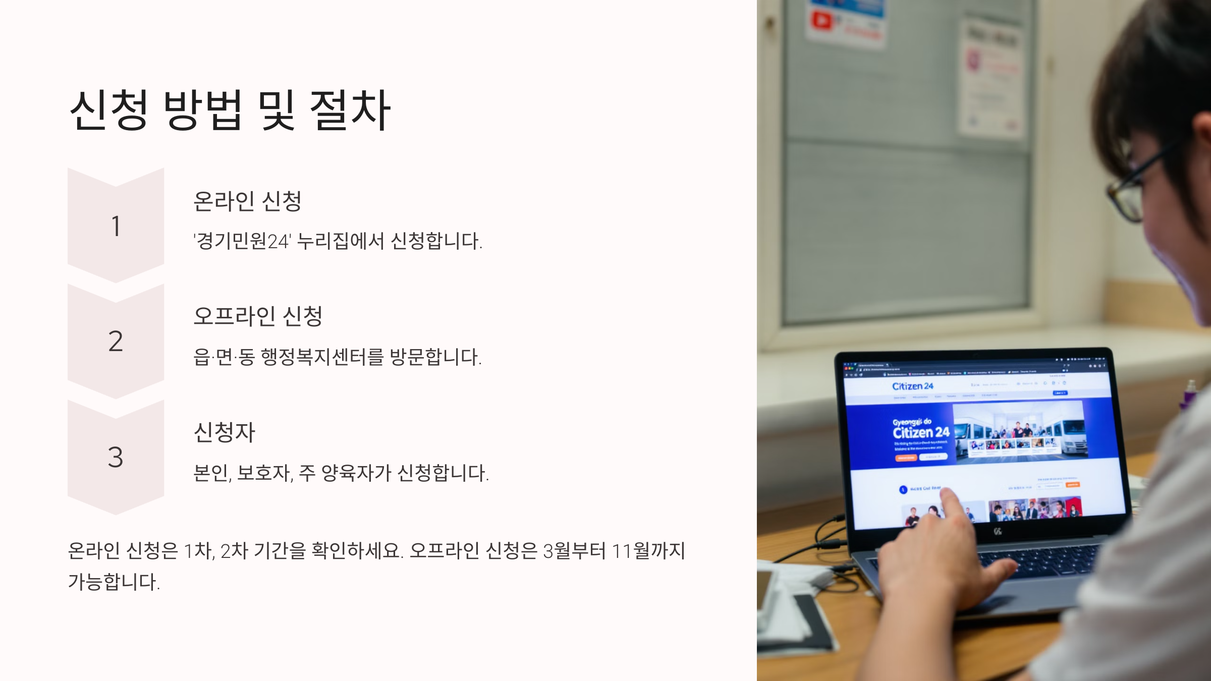 - 🏢 오프라인 신청: 주민센터(행정복지센터) 방문 후 신청서 제출