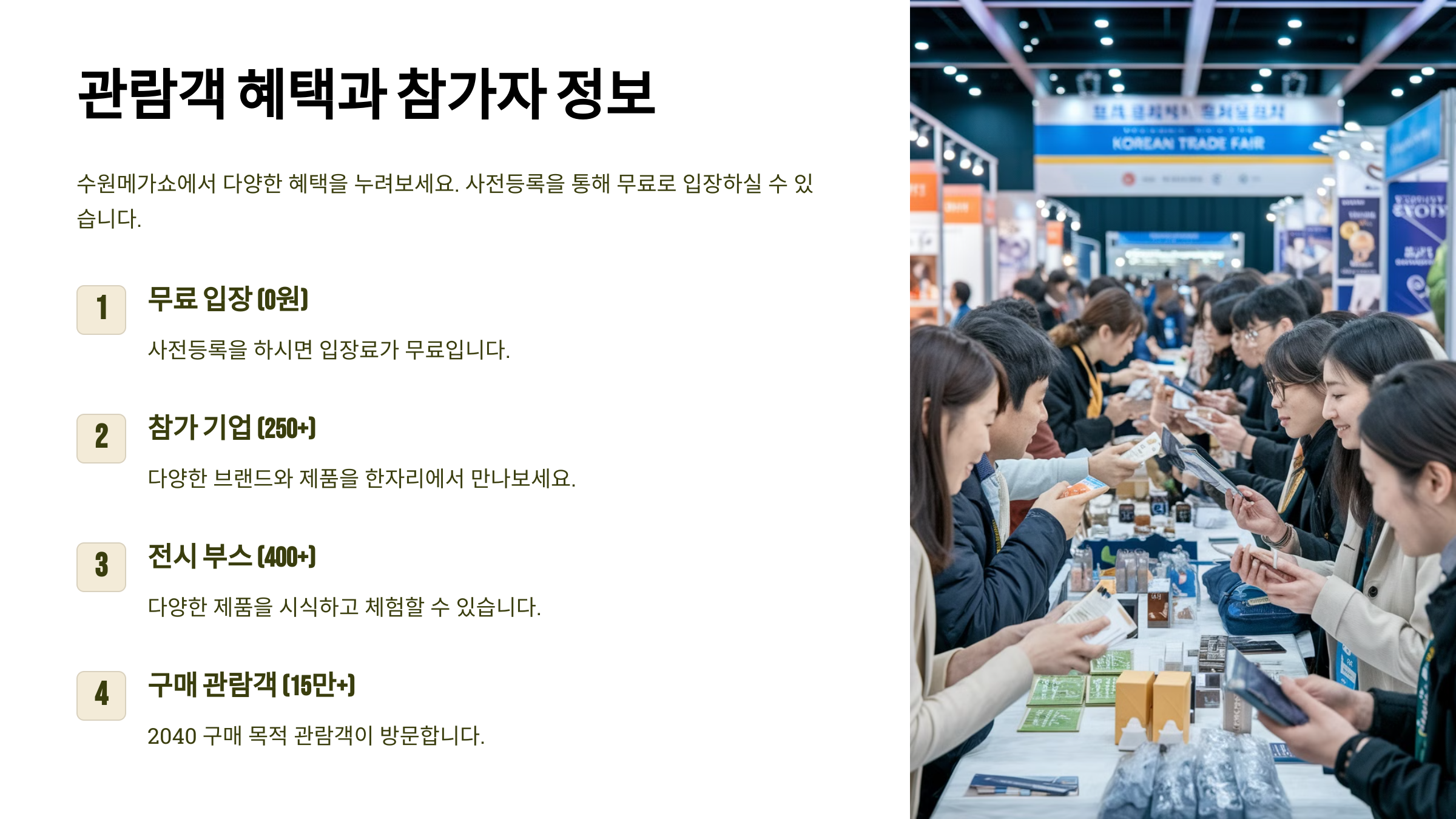 수원메가쇼에 참가하면 다양한 혜택을 받을 수 있어요. 사전 등록, 특별 할인, 시식 및 체험까지! 이번 박람회에서 누릴 수 있는 혜택들을 정리해볼게요. 😊