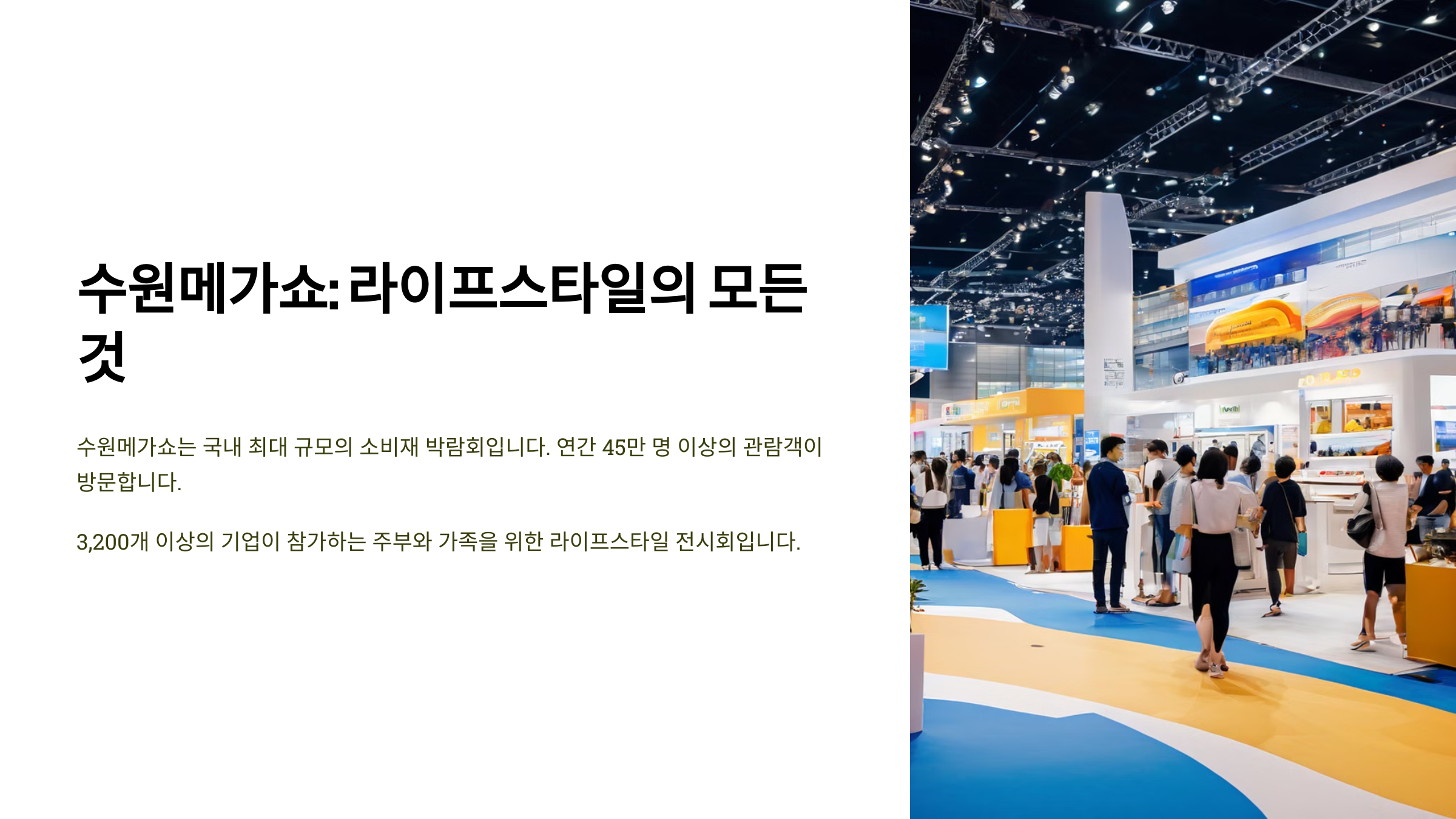 수원메가쇼는 국내 최대 B2C 라이프스타일 박람회로, 소비자들에게 최신 트렌드와 다양한 제품을 소개하는 행사예요. 홈&리빙, 푸드, 뷰티, 패션, 가전 등 일상에서 필요한 모든 품목을 한자리에서 만날 수 있답니다. 🎊