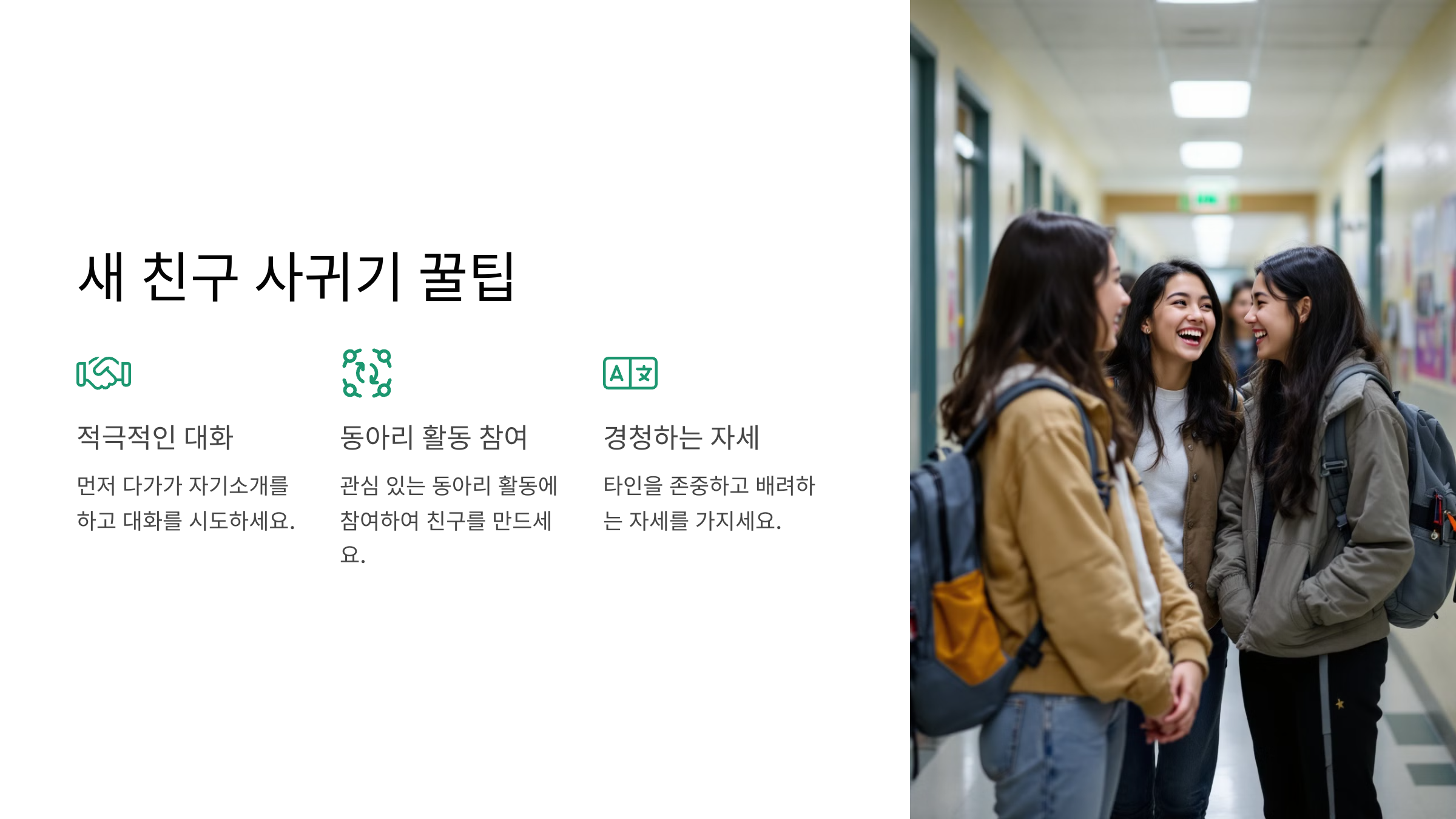 새 학년이 되면 반도 바뀌고 새로운 친구들을 만날 기회가 많아져요. 친구를 사귀는 것이 어렵게 느껴질 수도 있지만, 작은 노력만으로도 좋은 친구들을 만들 수 있어요.