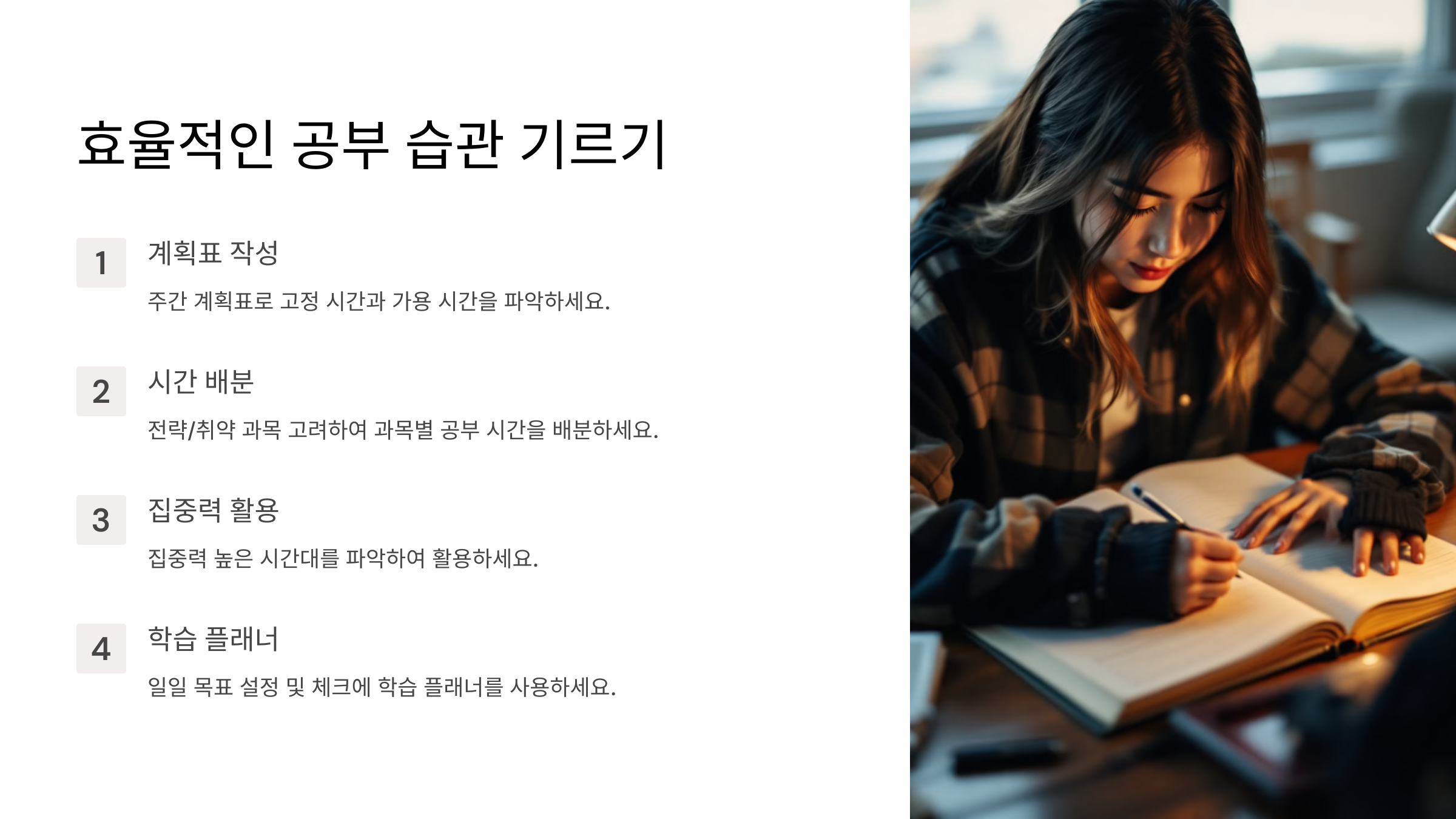 우선, 하루에 일정한 시간을 정해놓고 공부하는 습관을 들이면 좋아요. 예를 들어, 저녁 7시부터 9시까지는 숙제와 복습을 하는 시간으로 정해두면 규칙적으로 공부할 수 있답니다.