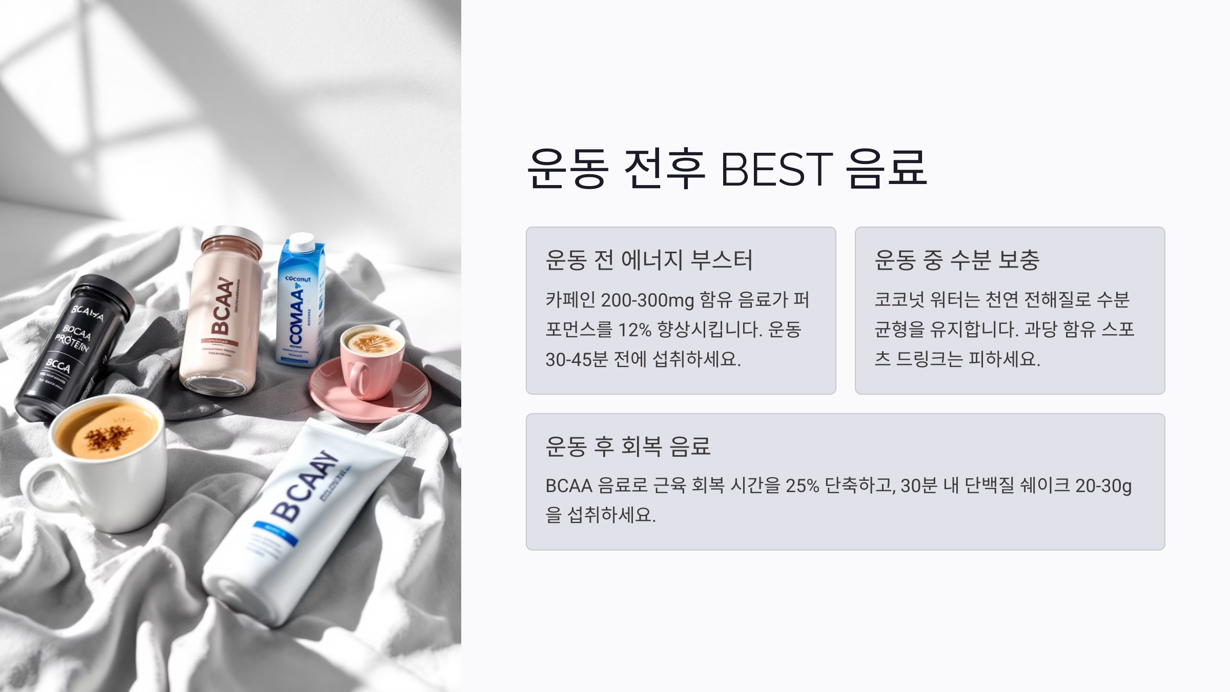 운동 성과를 높이려면 운동 전후에 무엇을 마시는지도 중요해요. 단순히 물만 마시는 것보다 필요한 영양소를 공급해주는 음료를 선택하면 훨씬 좋아요.