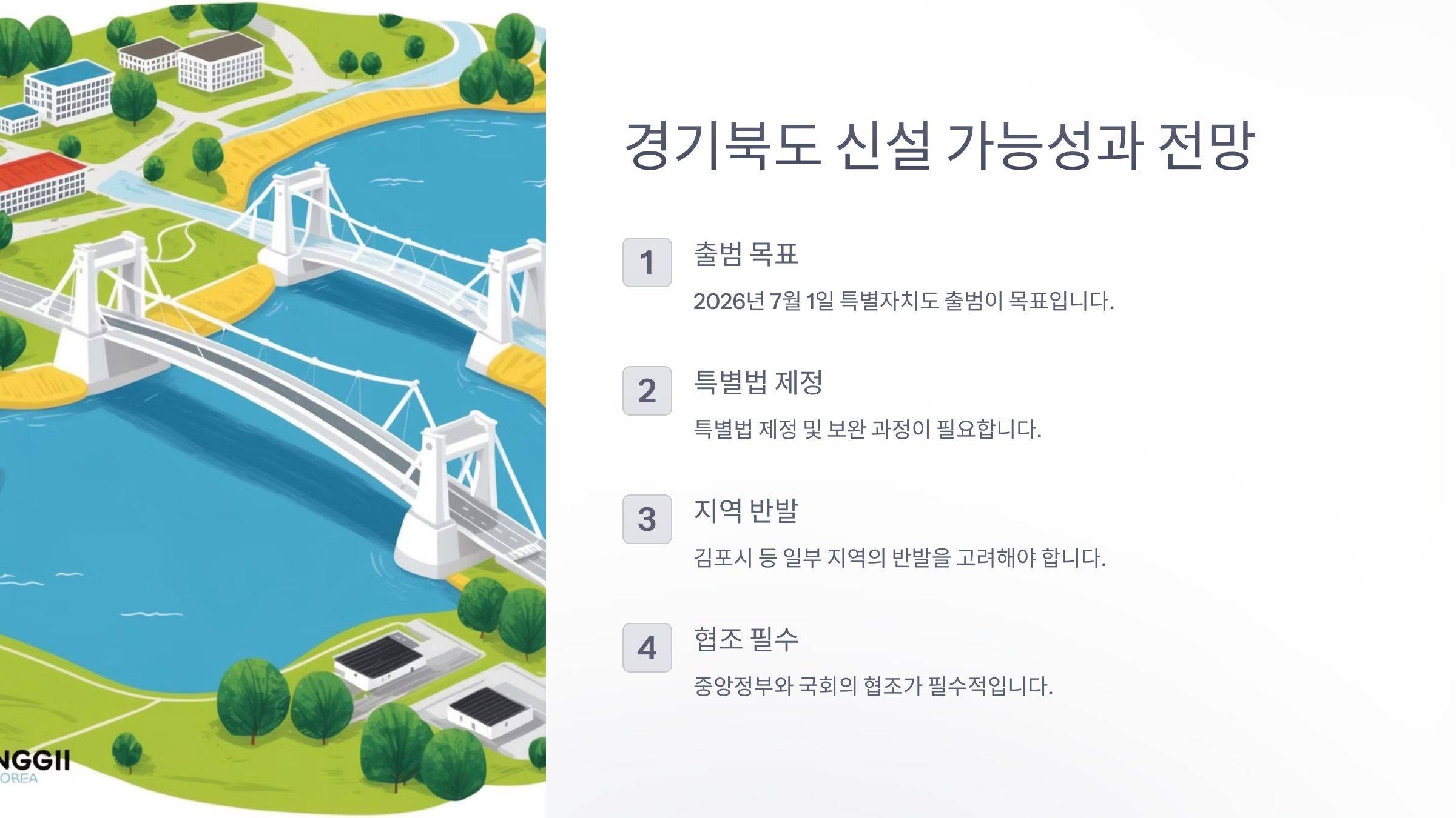 현재 경기북도 신설 논의는 계속되고 있지만, 실현되려면 넘어야 할 산이 많아요. 먼저 국회에서 '경기북도 설치 법안'이 통과되어야 해요. 하지만 행정 비용 문제와 남부 지역의 반발로 인해 쉽지 않은 상황이죠.